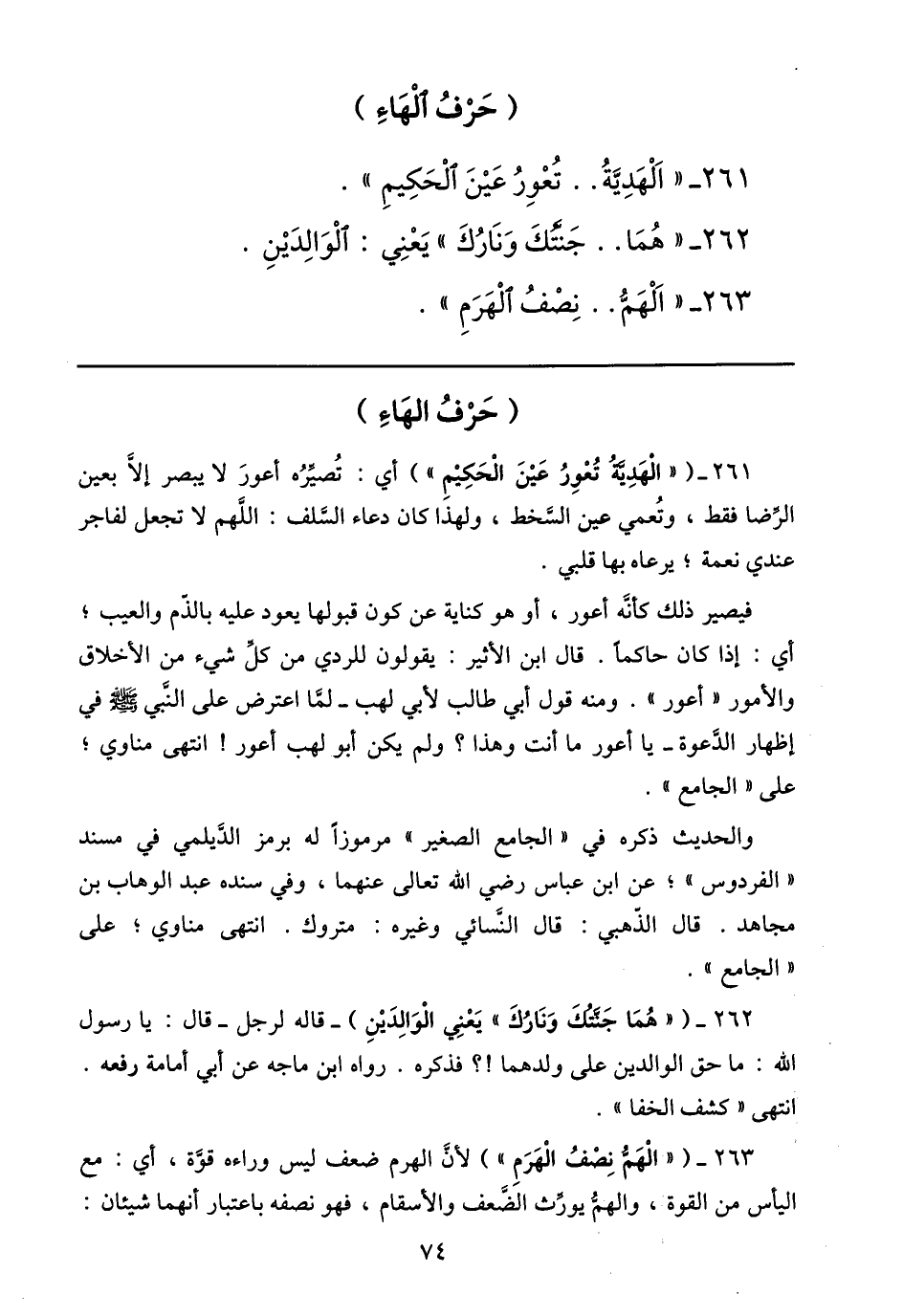 (حرف الهاء) 261- ( «الهديّة تعور عين الحكيم» ) أي: تصيّره أعور لا يبصر إلّا بعين الرّضا فقط، وتعمي عين السّخط، ولهذا كان دعاء السّلف: اللهم لا تجعل لفاجر عندي نعمة؛ يرعاه بها قلبي.