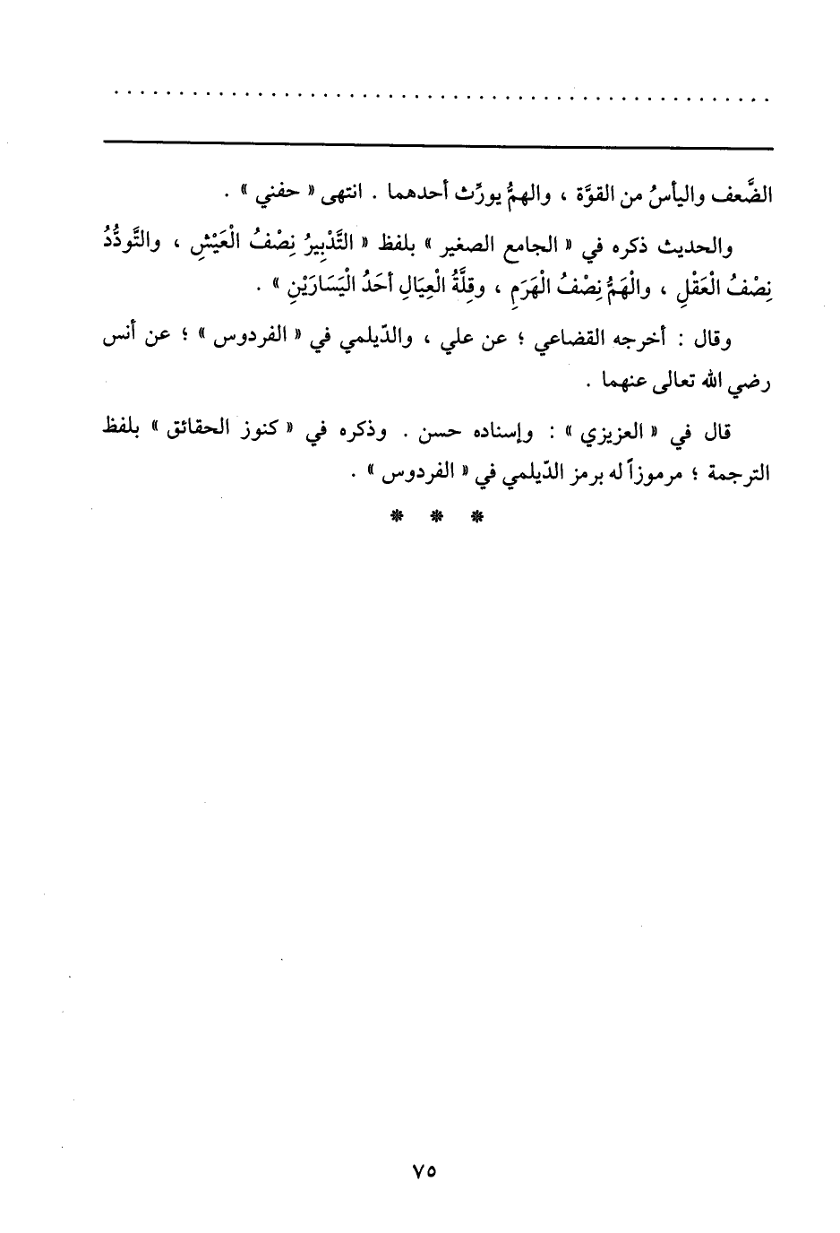 والحديث ذكره في «الجامع الصغير» بلفظ «التّدبير نصف العيش، والتّودّد نصف العقل، والهمّ نصف الهرم، وقلّة العيال أحد اليسارين» .