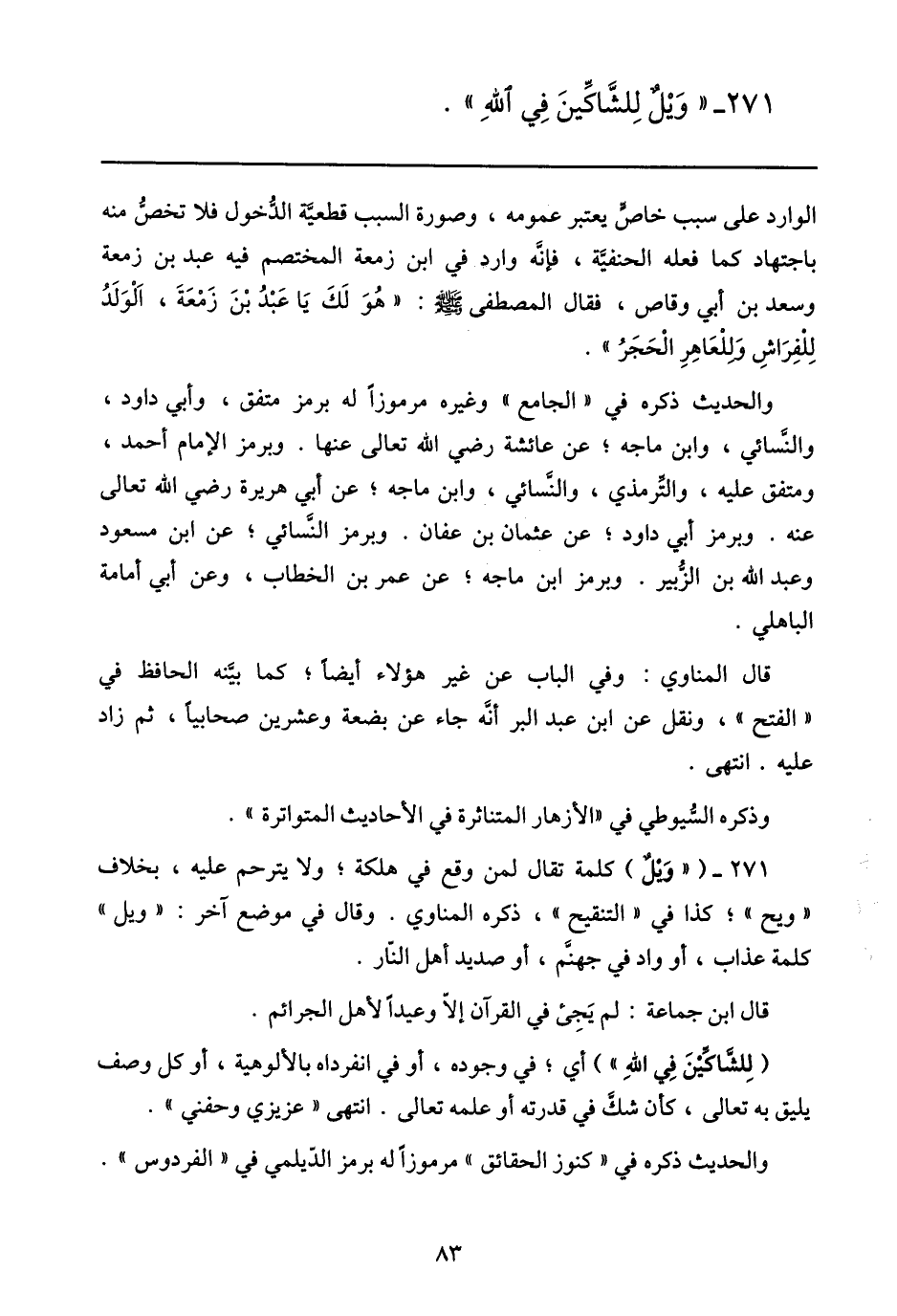 271- ( «ويل) كلمة تقال لمن وقع في هلكة؛ ولا يترحم عليه، بخلاف «ويح» ؛ كذا في «التنقيح» ، ذكره المناوي. وقال في موضع آخر: «ويل» كلمة عذاب، أو واد في جهنّم، أو صديد أهل النّار.