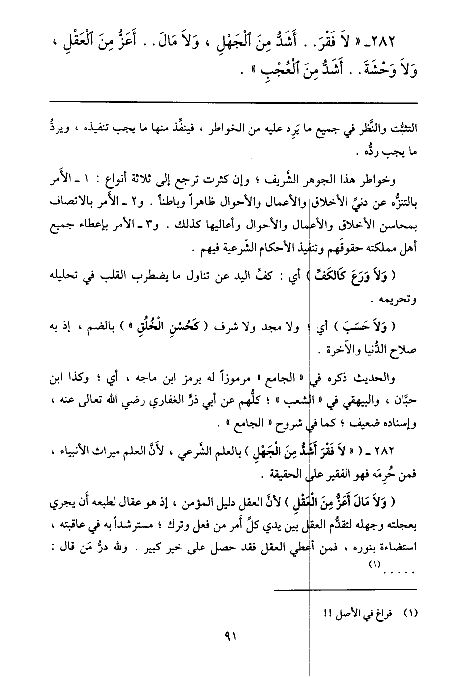 282- ( «لا فقر أشدّ من الجهل) بالعلم الشّرعي، لأنّ العلم ميراث الأنبياء، فمن حرمه فهو الفقير على الحقيقة.