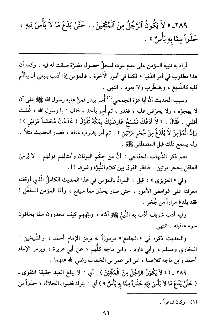289- ( «لا يكون الرّجل من المتّقين) - أي: لا يبلغ العبد حقيقة التّقوى- (حتّى يدع ما لا بأس فيه حذرا ممّا به بأس» ) أي: يترك فضول الحلال؛ حذرا من