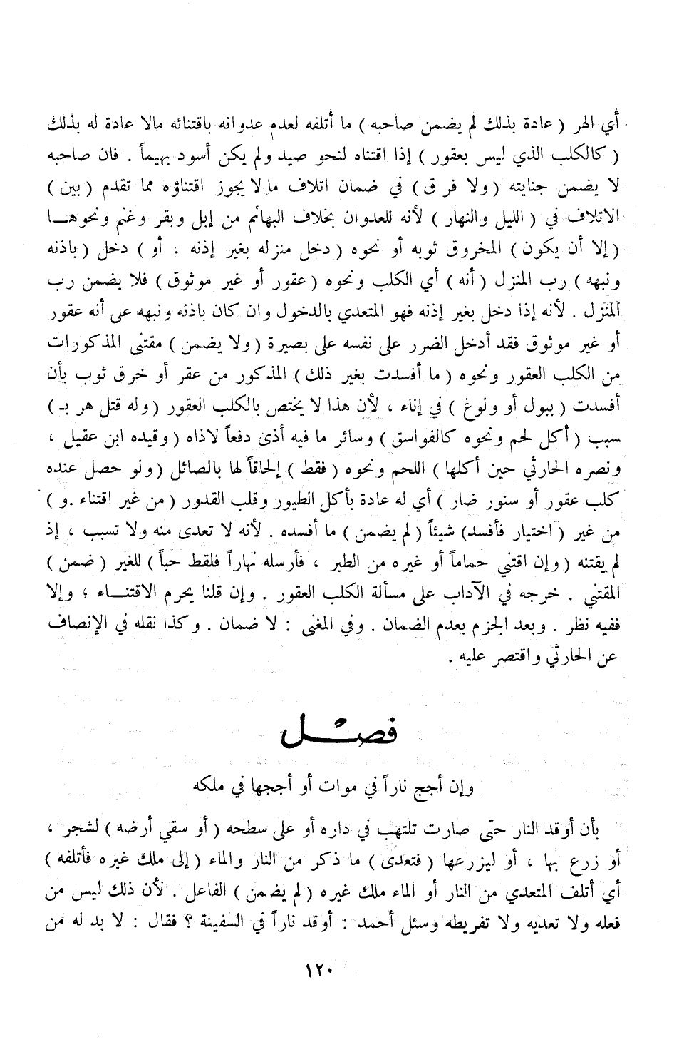 (فَصْلٌ وَإِنْ أَجَّجَ نَارًا فِي مَوَاتٍ أَوْ أَجَّجَهَا فِي مِلْكِهِ) بِأَنْ أَوْقَدَ النَّارَ حَتَّى صَارَتْ تَلْتَهِبُ فِي دَارِهِ أَوْ عَلَى سَطْحِهِ (أَوْ سَقَى أَرْضَهُ) لِشَجَرٍ أَوْ زَرْعٍ بِهَا أَوْ لِيَزْرَعَهَا (فَتَعَدَّى) مَا ذُكِرَ مِنْ النَّارِ وَالْمَاءِ (إلَى مِلْكِ غَيْرِهِ فَأَتْلَفَهُ) أَيْ: أَتْلَفَ الْمُتَعَدِّي مِنْ النَّارِ أَوْ الْمَاءِ مِلْكَ غَيْرِهِ (لَمْ يَضْمَنْ) الْفَاعِلُ؛ لِأَنَّ ذَلِكَ لَيْسَ مِنْ فِعْلِهِ وَلَا تَعَدِّيهِ وَلَا تَفْرِيطِهِ وَسُئِلَ أَحْمَدُ: أَوْقَدَ نَارًا فِي السَّفِينَةِ؟ فَقَالَ: لَا بُدَّ لَهُ مِنْ