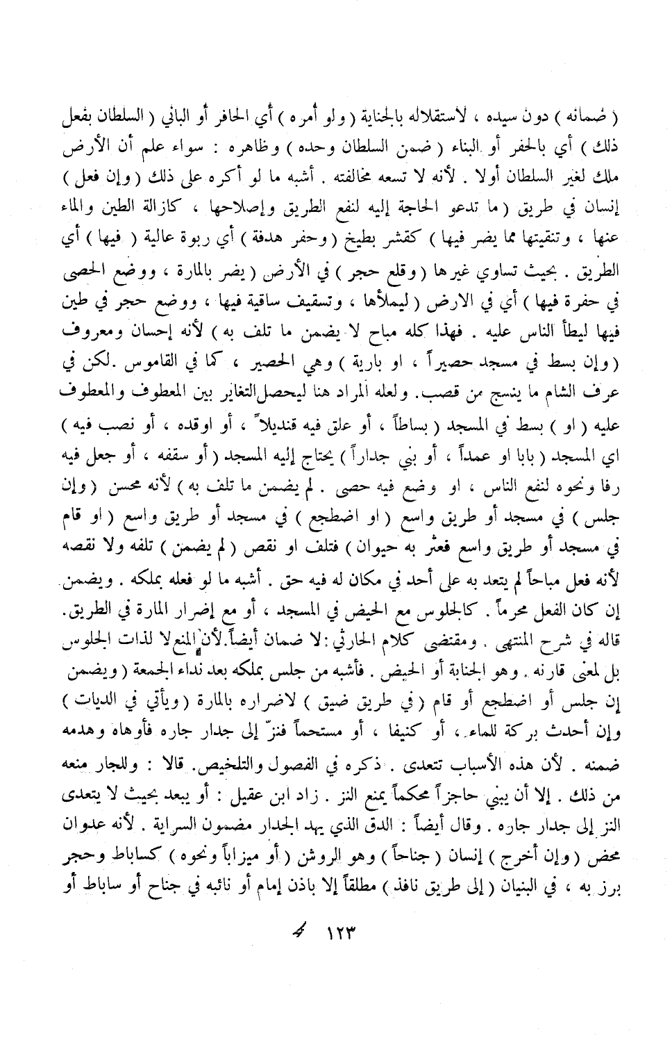 (وَإِنْ جَلَسَ) فِي مَسْجِدٍ أَوْ طَرِيقٍ وَاسِعٍ (أَوْ اضْطَجَعَ) فِي مَسْجِدٍ أَوْ طَرِيقٍ وَاسِعٍ (أَوْ قَامَ فِي مَسْجِدٍ أَوْ طَرِيقٍ وَاسِعٍ فَعَثَرَ بِهِ حَيَوَانٌ) فَتَلِفَ أَوْ نَقَصَ (لَمْ يَضْمَنْ) تَلَفَهُ وَلَا نَقْصَهُ؛ لِأَنَّهُ فَعَلَ مُبَاحًا لَمْ يَتَعَدَّ بِهِ عَلَى أَحَدٍ فِي مَكَان لَهُ فِيهِ حَقٌّ أَشْبَهَ مَا لَوْ فَعَلَهُ بِمِلْكِهِ وَيَضْمَنُ إنْ كَانَ الْفِعْلُ مُحَرَّمًا كَالْجُلُوسِ مَعَ الْحَيْضِ فِي الْمَسْجِدِ أَوْ مَعَ إضْرَارِ الْمَارَّةِ فِي الطَّرِيقِ قَالَهُ فِي شَرْحِ الْمُنْتَهَى وَمُقْتَضَى كَلَامِ الْحَارِثِيِّ: لَا ضَمَانَ أَيْضًا؛ لِأَنَّ الْمَنْعَ لَا لِذَاتِ الْجُلُوسِ بَلْ لِمَعْنًى قَارَنَهُ وَهُوَ الْجَنَابَةُ أَوْ الْحَيْضُ فَأَشْبَهَ مَنْ جَلَسَ بِمِلْكِهِ بَعْدَ نِدَاءِ الْجُمُعَةِ.
