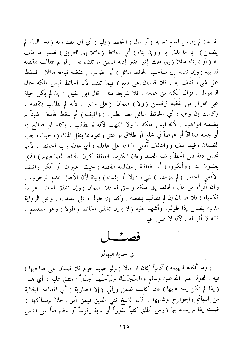 (فَصْلٌ) فِي جِنَايَةِ الْبَهَائِمِ (وَمَا أَتْلَفَتْهُ الْبَهِيمَةُ) آدَمِيًّا كَانَ أَوْ مَالًا (وَلَوْ صَيْدَ حَرَمٍ فَلَا ضَمَانَ عَلَى صَاحِبِهَا) فِيهِ لِقَوْلِهِ - صَلَّى اللَّهُ عَلَيْهِ وَسَلَّمَ - «الْعَجْمَاءُ جَرْحُهَا جُبَارٌ» مُتَّفَقٌ عَلَيْهِ أَيْ: هَدَرٌ (إذَا لَمْ تَكُنْ يَدُهُ عَلَيْهَا) فَإِنْ كَانَتْ ضَمِنَ وَيَأْتِي (إلَّا الضَّارِبَةَ) أَيْ: الْمُعْتَادَةَ بِالْجِنَايَةِ مِنْ الْبَهَائِمِ وَالْجَوَارِحِ وَشِبْهِهَا قَالَ الشَّيْخُ تَقِيُّ الدِّينِ فِيمَنْ أَمَرَ رَجُلًا بِإِمْسَاكِهَا: ضَمِنَهُ إذَا لَمْ يُعْلِمْهُ بِهَا.