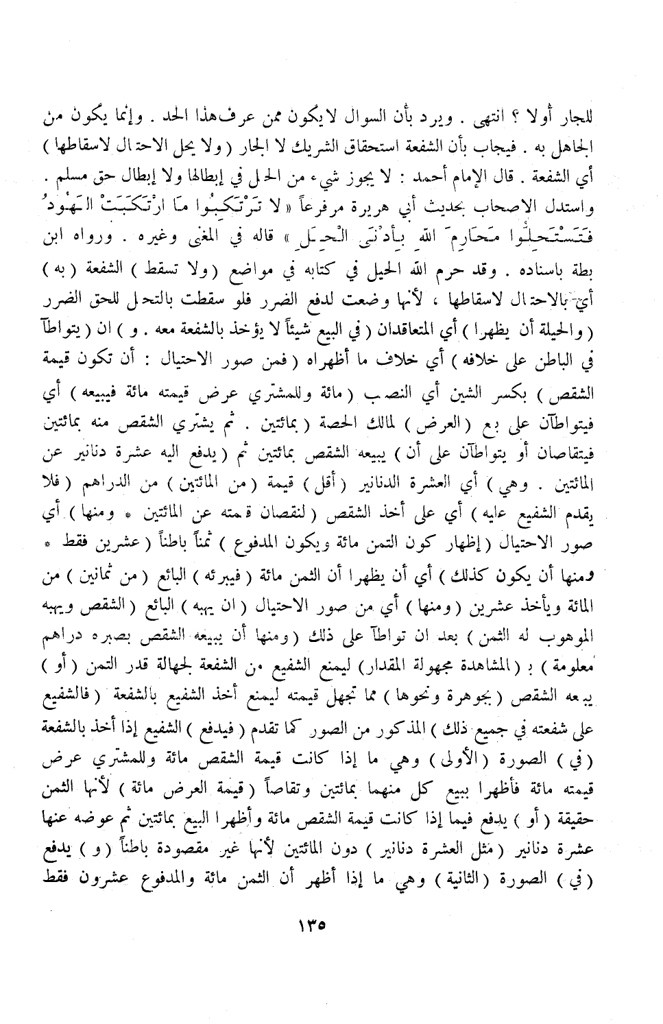 (وَالْحِيلَةُ أَنْ يُظْهِرَا) أَيْ: الْمُتَعَاقِدَانِ (فِي الْبَيْعِ شَيْئًا لَا يُؤْخَذُ بِالشُّفْعَةِ مَعَهُ وَ) أَنْ (يَتَوَاطَآ فِي الْبَاطِنِ عَلَى خِلَافِهِ) أَيْ: خِلَافِ مَا أَظْهَرَاهُ (فَمِنْ صُوَرِ الِاحْتِيَال: أَنْ تَكُونَ قِيمَةُ الشِّقْصِ) بِكَسْرِ الشِّينِ أَيْ: النَّصِيبِ (مِائَةً وَلِلْمُشْتَرِي عَرَضٌ قِيمَتِهِ مِائَةً فَيَبِيعُهُ) أَيْ: فَيَتَوَاطَآنِ عَلَى بَيْعِ (الْعَرَضِ) لِمَالِكِ الْحِصَّةِ (بِمِائَتَيْنِ ثُمَّ يَشْتَرِي الشِّقْصَ مِنْهُ بِمِائَتَيْنِ فَيَتَقَاصَّانِ أَوْ يَتَوَاطَآنِ عَلَى أَنْ) يَبِيعَهُ الشِّقْصَ بِمِائَتَيْنِ ثُمَّ (يَدْفَعَ إلَيْهِ عَشَرَةَ دَنَانِيرَ عَنْ الْمِائَتَيْنِ وَهِيَ) أَيْ: الْعَشَرَةُ الدَّنَانِيرُ (أَقَلُّ) قِيمَةً مِنْ الْمِائَتَيْنِ مِنْ الدَّرَاهِمِ (فَلَا يُقَدَّمُ الشَّفِيعُ عَلَيْهِ) أَيْ: عَلَى أَخْذِ الشِّقْصِ (لِنُقْصَانِ قِيمَتِهِ عَنْ الْمِائَتَيْنِ وَمِنْهَا) أَيْ: صُوَرِ الِاحْتِيَالِ (إظْهَارُ كَوْنِ الثَّمَنِ مِائَةً وَيَكُونُ الْمَدْفُوعُ) ثَمَنًا بَاطِنًا (عِشْرِينَ فَقَطْ وَمِنْهَا أَنْ يَكُونَ كَذَلِكَ) أَيْ: أَنْ يُظْهِرَا أَنَّ الثَّمَنَ مِائَةٌ (فَيُبَرِّئُهُ) الْبَائِعُ مِنْ ثَمَانِينَ مِنْ الْمِائَةِ وَيَأْخُذُ عِشْرِينَ.