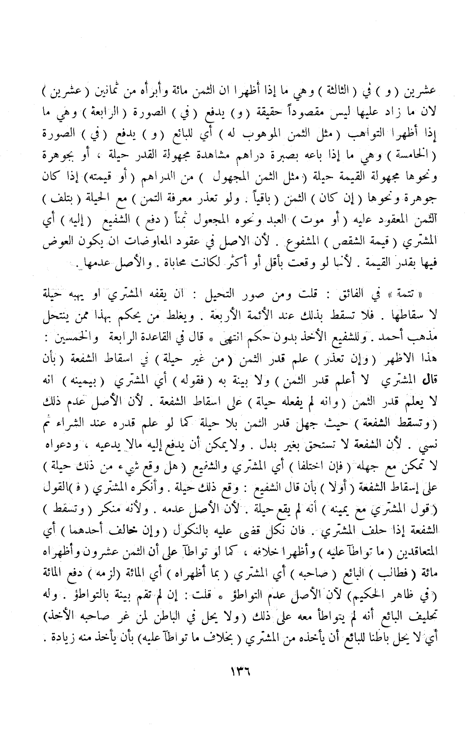 (وَ) يَدْفَعُ (فِي) الصُّورَةِ (الْخَامِسَةِ) وَهِيَ مَا إذَا بَاعَهُ بِصُبْرَةِ دَرَاهِمَ مُشَاهَدَةً مَجْهُولَةِ الْقَدْرِ حِيلَةً أَوْ بِجَوْهَرَةٍ وَنَحْوِهَا مَجْهُولَةِ الْقِيمَةِ حِيلَةً (مِثْلَ الثَّمَنِ الْمَجْهُولِ) مِنْ الدَّرَاهِمِ (أَوْ قِيمَتِهِ) إذَا كَانَ جَوْهَرَةً وَنَحْوَهَا (إنْ كَانَ) الثَّمَنُ (بَاقِيًا وَلَوْ تَعَذَّرَ مَعْرِفَةُ الثَّمَنِ) مَعَ الْحِيلَةِ (بِتَلَفِ) الثَّمَنِ الْمَعْقُودِ عَلَيْهِ (أَوْ مَوْتِ) الْعَبْدِ وَنَحْوِهِ الْمَجْعُولِ ثَمَنًا (دَفَعَ) الشَّفِيعُ (إلَيْهِ) أَيْ: الْمُشْتَرِي (قِيمَةَ الشِّقْصِ) الْمَشْفُوعِ؛ لِأَنَّ الْأَصْلَ فِي عُقُودِ الْمُعَاوَضَاتِ أَنْ يَكُونَ الْعِوَضُ فِيهَا بِقَدْرِ الْقِيمَةِ؛ لِأَنَّهَا لَوْ وَقَعَتْ بِأَقَلَّ أَوْ أَكْثَرَ لَكَانَتْ مُحَابَاةً وَالْأَصْلُ عَدَمُهَا " تَتِمَّةٌ " فِي الْفَائِقِ قُلْت: وَمِنْ صُوَرِ التَّحَيُّلِ: أَنْ يَقِفَهُ الْمُشْتَرِي أَوْ يَهَبَهُ حِيلَةً لِإِسْقَاطِهَا فَلَا تَسْقُطُ بِذَلك عِنْدَ الْأَئِمَّةِ الْأَرْبَعَةِ وَيَغْلُطُ مَنْ يَحْكُمُ بِهَذَا مِمَّنْ يَنْتَحِلُ مَذْهَبَ أَحْمَدَ وَلِلشَّفِيعِ الْأَخْذُ بِدُونِ حُكْمٍ انْتَهَى قَالَ فِي الْقَاعِدَةِ الرَّابِعَةِ وَالْخَمْسِينَ: مِنْ الْأَظْهَرِ.