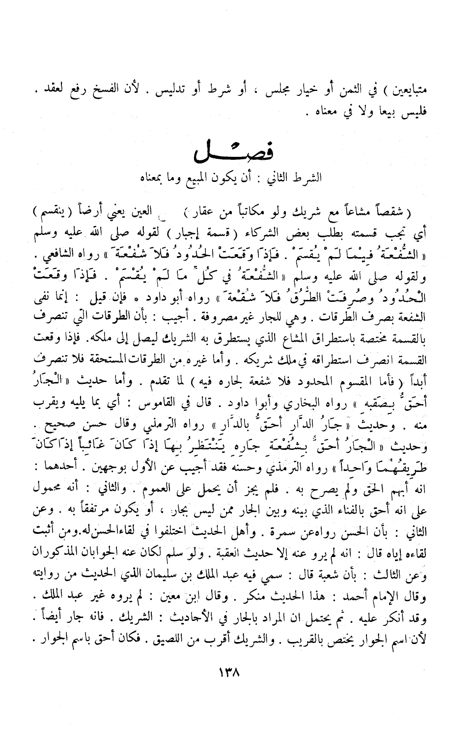 (فَصْلٌ:) الشَّرْطُ (الثَّانِي: أَنْ يَكُونَ) الْمَبِيعُ وَمَا بِمَعْنَاهُ (شِقْصًا مُشَاعًا مَعَ شَرِيكٍ وَلَوْ مُكَاتَبًا مِنْ عَقَارٍ) بِفَتْحِ الْعَيْنِ يَعْنِي أَرْضًا (يَنْقَسِمُ) أَيْ: تَجِبُ قِسْمَتُهُ بِطَلَبِ بَعْضِ الشُّرَكَاءِ (قِسْمَةَ إجْبَارٍ) لِقَوْلِهِ - صَلَّى اللَّهُ عَلَيْهِ وَسَلَّمَ - «الشُّفْعَةُ فِيمَا لَمْ يُقْسَمْ فَإِذَا وَقَعَتْ الْحُدُودُ فَلَا شُفْعَةَ» رَوَاهُ الشَّافِعِيُّ وَلِقَوْلِهِ - صَلَّى اللَّهُ عَلَيْهِ وَسَلَّمَ - «الشُّفْعَةُ فِي كُلِّ مَا لَمْ يُقْسَمْ فَإِذَا وَقَعَتْ الْحُدُودُ وَصُرِفَتْ الطُّرُقُ فَلَا شُفْعَةَ» رَوَاهُ أَبُو دَاوُد فَإِنْ قِيلَ: إنَّمَا نَفَى الشُّفْعَةَ بِصَرْفِ الطُّرُقَاتِ وَهِيَ لِلْجَارِ غَيْرُ مَصْرُوفَةٍ أُجِيبُ: بِأَنَّ الطُّرُقَاتِ الَّتِي تَنْصَرِفُ بِالْقِسْمَةِ مُخْتَصَّةٌ بِاسْتِطْرَاقِ الْمُشَاعِ الَّذِي يَسْتَطْرِقُ بِهِ الشَّرِيكُ لِيَصِلَ إلَى مِلْكِهِ فَإِذَا وَقَعَتْ الْقِسْمَةُ انْصَرَفَ اسْتِطْرَاقُهُ فِي مِلْكِ شَرِيكِهِ وَأَمَّا غَيْرُهُ مِنْ الطُّرُقَاتِ الْمُسْتَحَقَّةِ فَلَا تَنْصَرِفُ أَبَدًا (فَأَمَّا الْمَقْسُومُ الْمَحْدُودُ فَلَا شُفْعَةَ لِجَارِهِ فِيهِ) لِمَا تَقَدَّمَ.