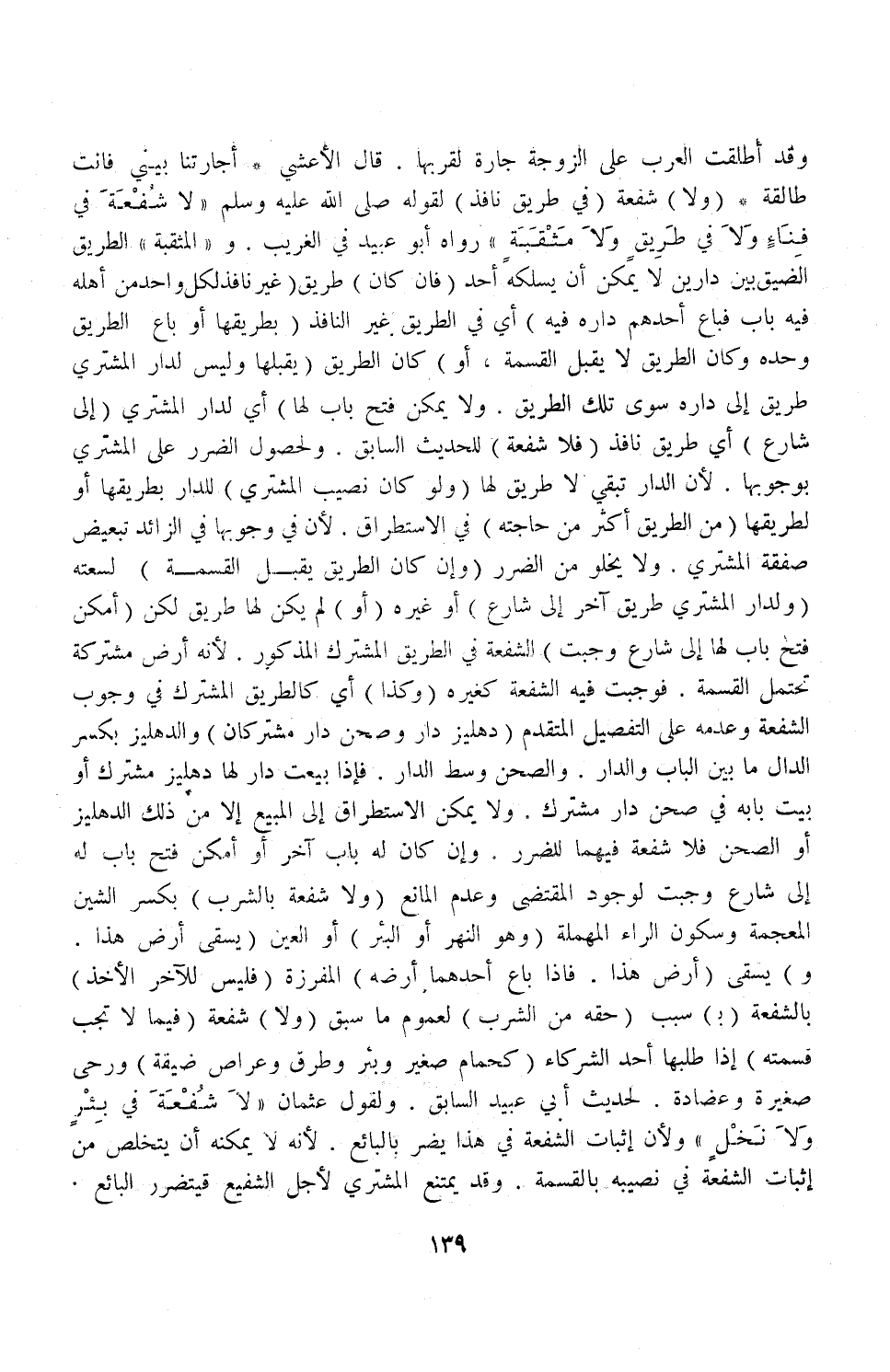 (وَلَا) شُفْعَةَ (فِي طَرِيقٍ نَافِذٍ) لِقَوْلِهِ - صَلَّى اللَّهُ عَلَيْهِ وَسَلَّمَ - «لَا شُفْعَةَ فِي فِنَاءٍ وَلَا فِي طَرِيقٍ وَلَا مَثْقَبَةٍ» رَوَاهُ أَبُو عُبَيْدٍ فِي الْغَرِيبِ وَ " الْمَثْقَبَةُ " الطَّرِيقُ الضَّيِّقُ بَيْنَ دَارَيْنِ لَا يُمْكِنُ أَنْ يَسْلُكَهُ أَحَدٌ (فَإِنْ كَانَ طَرِيقٌ غَيْرُ نَافِذٍ لِكُلِّ وَاحِدٍ مِنْ أَهْلِهِ فِيهِ بَابٌ فَبَاعَ أَحَدُهُمَا دَارِهِ فِيهِ) أَيْ: فِي الطَّرِيقِ غَيْرِ النَّافِذِ (بِطَرِيقِهَا أَوْ بَاعَ الطَّرِيقَ وَحْدَهُ وَكَانَ الطَّرِيقُ لَا يَقْبَلُ الْقِسْمَةَ أَوْ) كَانَ الطَّرِيقُ (يَقْبَلُهَا وَلَيْسَ لِدَارِ الْمُشْتَرِي طَرِيقٌ إلَى دَارِهِ سِوَى تِلْكَ الطَّرِيقِ وَلَا يُمْكِنُ فَتْحُ بَابٍ لَهَا) أَيْ: لِدَارِ الْمُشْتَرِي (إلَى شَارِعٍ) أَيْ: طَرِيقٍ نَافِذٍ (فَلَا شُفْعَةَ) لِلْحَدِيثِ السَّابِقِ وَلِحُصُولِ الضَّرَرِ عَلَى الْمُشْتَرِي بِوُجُوبِهَا؛ لِأَنَّ الدَّارَ تَبْقَى لَا طَرِيقَ لَهَا.