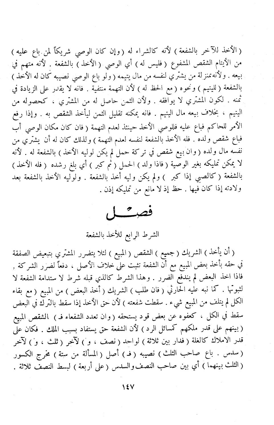 (فَصْلٌ) الشَّرْطُ (الرَّابِعُ) لِلْأَخْذِ بِالشُّفْعَةِ (أَنْ يَأْخُذَ) الشَّرِيكُ (جَمِيعَ) الشِّقْصِ (الْمَبِيعِ) لِئَلَّا يَتَضَرَّرَ الْمُشْتَرِي بِتَبْعِيضِ الصَّفْقَةِ فِي حَقِّهِ بِأَخْذِ بَعْضِ الْمَبِيعِ مَعَ أَنَّ الشُّفْعَةَ تَثْبُتُ عَلَى خِلَافِ الْأَصْلِ دَفْعًا لِضَرَرِ الشَّرِكَةِ فَإِذَا أَخَذَ الْبَعْضَ لَمْ يَنْدَفِعْ الضَّرَرُ وَهَذَا الشَّرْطُ كَاَلَّذِي قَبْلَهُ شَرْطٌ لِاسْتِدَامَةِ الشُّفْعَةِ لَا لِثُبُوتِهَا كَمَا نَبَّهَ عَلَيْهِ الْحَارِثِيُّ (فَإِنْ طَلَبَ) الشَّرِيكُ (أَخْذَ الْبَعْضِ) مِنْ الْمَبِيعِ (مَعَ بَقَاءِ الْكُلِّ لَمْ يَتْلَفْ مِنْ الْمَبِيعِ شَيْءٌ سَقَطَتْ شُفْعَتُهُ) ؛ لِأَنَّ حَقَّ الْأَخْذِ إذَا سَقَطَ بِالتَّرْكِ فِي الْبَعْضِ سَقَطَ فِي الْكُلِّ كَعَفْوِهِ عَنْ بَعْضِ قَوَدٍ يَسْتَحِقُّهُ.