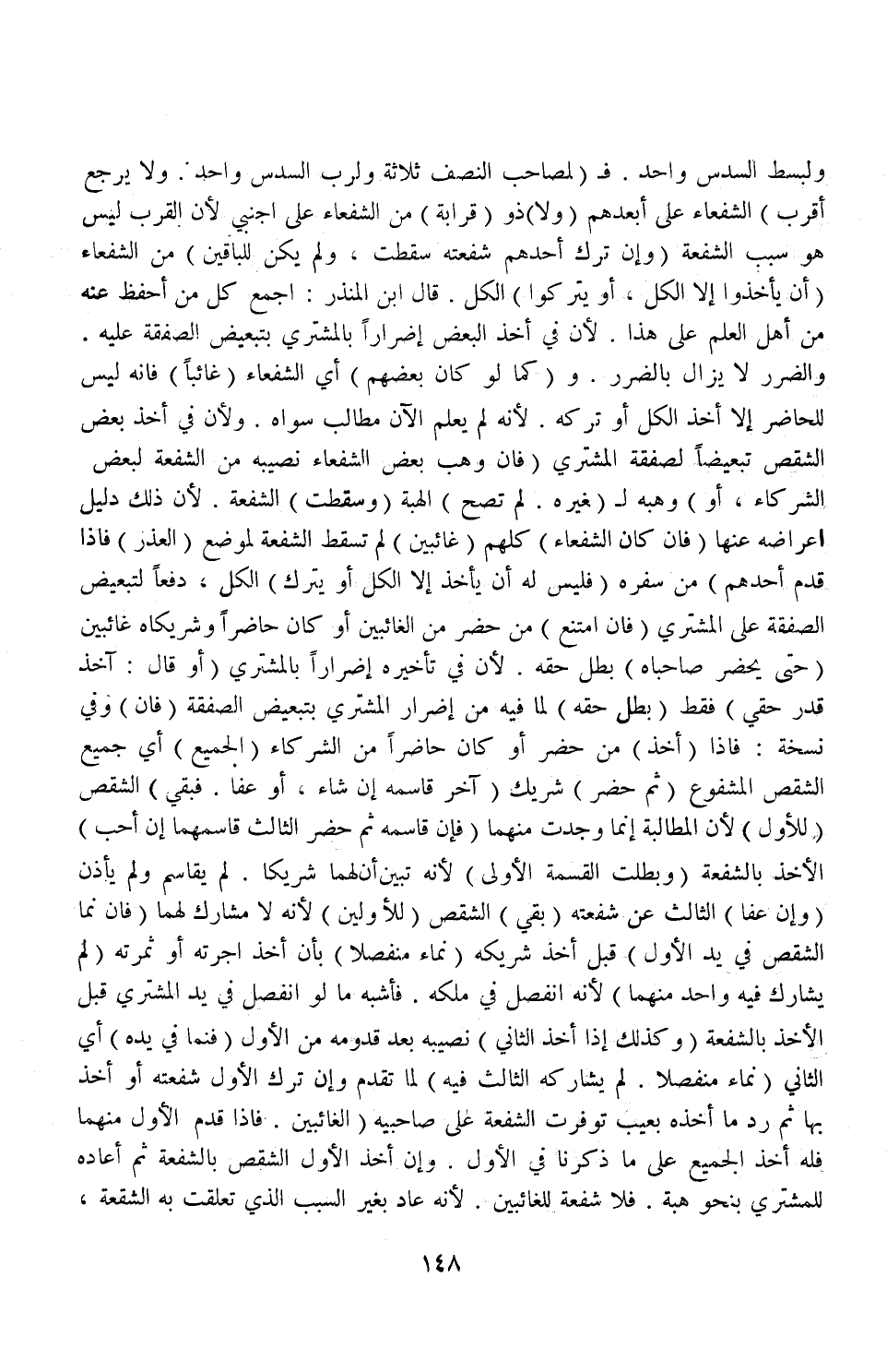 وَلِبَسْطِ السُّدُسِ وَاحِدٌ فَ (لِصَاحِبِ النِّصْفِ ثَلَاثَةٌ وَلِرَبِّ السُّدُسِ وَاحِدٌ وَلَا يَرْجِعُ أَقْرَبُ) الشُّفَعَاءِ عَلَى أَبْعَدِهِمْ (وَلَا) ذُو قَرَابَةٍ مِنْ الشُّفَعَاءِ عَلَى أَجْنَبِيٍّ؛ لِأَنَّ الْقُرْبَ لَيْسَ هُوَ سَبَبَ الشُّفْعَةِ.