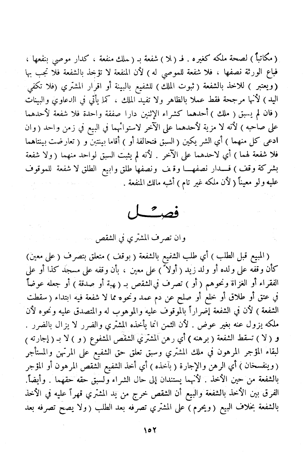 (فَصْلٌ، وَإِنْ تَصَرَّفَ الْمُشْتَرِي فِي) الشِّقْصِ (الْمَبِيعِ قَبْلَ الطَّلَبِ) أَيْ: طَلَبِ الشَّفِيعِ بِالشُّفْعَةِ (بِوَقْفٍ) مُتَعَلِّقٍ بِتَصَرُّفٍ (عَلَى مُعَيَّنٍ) كَأَنْ وَقَفَهُ عَلَى وَلَدِهِ، أَوْ وَلَدِ زَيْدٍ (أَوَّلًا) عَلَى مُعَيَّنٍ، بِأَنْ وَقَفَهُ عَلَى مَسْجِدِ كَذَا، أَوْ عَلَى الْفُقَرَاءِ، أَوْ الْغُزَاةِ وَنَحْوِهِمْ (، أَوْ) تَصَرَّفَ فِي الشِّقْصِ بِ (هِبَةٍ، أَوْ صَدَقَةٍ) ، أَوْ جَعَلَهُ عِوَضًا فِي عِتْقٍ، أَوْ طَلَاقٍ، أَوْ خُلْعٍ، أَوْ صُلْحٍ عَنْ دَمٍ عَمْدٍ وَنَحْوِهِ مِمَّا لَا شُفْعَةَ فِيهِ ابْتِدَاءً (سَقَطَتْ الشُّفْعَةُ) ؛ لِأَنَّ فِي الشُّفْعَةِ إضْرَارًا بِالْمَوْقُوفِ عَلَيْهِ وَالْمَوْهُوبِ لَهُ وَالْمُتَصَدَّقِ عَلَيْهِ وَنَحْوِهِ؛ لِأَنَّ مِلْكَهُ يَزُولُ عَنْهُ بِغَيْرِ عِوَضٍ؛ لِأَنَّ الثَّمَنَ إنَّمَا يَأْخُذُهُ الْمُشْتَرِي وَالضَّرَرُ لَا يُزَالُ بِالضَّرَرِ.