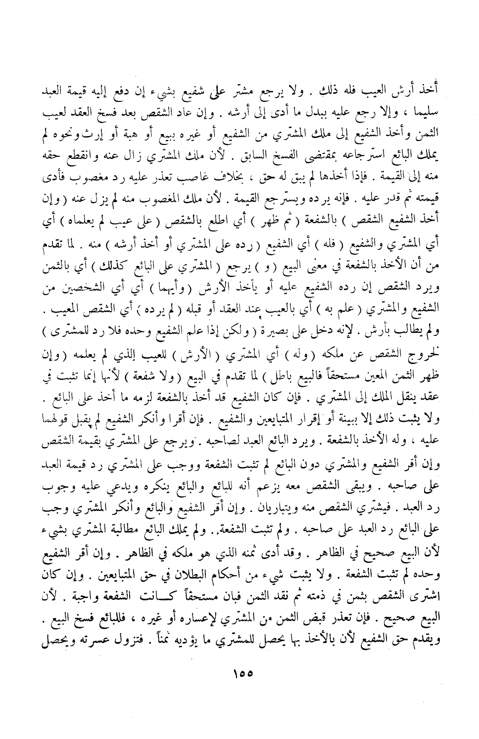 أَخْذَ أَرْشِ الْعَيْبِ فَلَهُ ذَلِكَ، وَلَا يَرْجِعُ مُشْتَرٍ عَلَى شَفِيعٍ بِشَيْءٍ، إنْ دَفَعَ إلَيْهِ قِيمَةَ الْعَبْدِ سَلِيمًا، وَإِلَّا رَجَعَ عَلَيْهِ بِبَدَلِ مَا أَدَّى إلَى أَرْشِهِ، وَإِنْ عَادَ الشِّقْصُ بَعْدَ فَسْخِ الْعَقْدِ لِعَيْبِ الثَّمَنِ وَأَخْذِ الشَّفِيعِ إلَى مِلْكِ الْمُشْتَرِي مِنْ الشَّفِيعِ، أَوْ غَيْرِهِ بِبَيْعٍ، أَوْ هِبَةٍ، أَوْ إرْثٍ وَنَحْوِهِ لَمْ يَمْلِكْ الْبَائِعُ اسْتِرْجَاعَهُ بِمُقْتَضَى الْفَسْخِ السَّابِقِ،؛ لِأَنَّ مِلْكَ الْمُشْتَرِي زَالَ عَنْهُ وَانْقَطَعَ حَقُّهُ مِنْهُ إلَى الْقِيمَةِ.