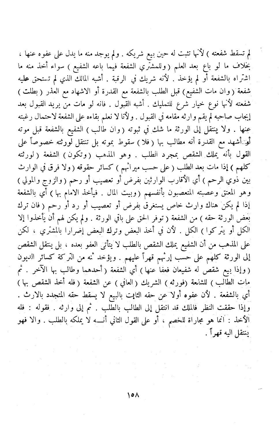 (وَلَا فَرْقَ فِي الْوَارِثِ بَيْنَ ذَوِي الرَّحِمِ) أَيْ: الْأَقَارِبِ الْوَارِثِينَ بِفَرْضٍ، أَوْ تَعْصِيبٍ، أَوْ رَحِمٍ (وَالزَّوْجِ وَالْمَوْلَى) وَهُوَ الْمُعْتَقُ وَعَصَبَتُهُ الْمُتَعَصِّبُونَ بِأَنْفُسِهِمْ (وَبَيْتِ الْمَالِ، فَيَأْخُذُ الْإِمَامُ بِهَا) أَيْ: بِالشُّفْعَةِ إذَا لَمْ يَكُنْ هُنَاكَ وَارِثٌ خَاصٌّ يَسْتَغْرِقُ بِفَرْضٍ، أَوْ تَعْصِيبٍ أَوْ رَدٍّ، أَوْ رَحِمٍ (فَإِنْ تَرَكَ بَعْضُ الْوَرَثَةِ حَقَّهُ) مِنْ الشُّفْعَةِ (تَوَفَّرَ الْحَقُّ عَلَى بَاقِي الْوَرَثَةِ وَلَمْ يَكُنْ لَهُمْ أَنْ يَأْخُذُوا إلَّا الْكُلَّ، أَوْ يَتْرُكُوا) الْكُلَّ؛ لِأَنَّ فِي أَخْذِ الْبَعْضِ وَتَرْكِ الْبَعْضِ إضْرَارًا بِالْمُشْتَرِي، لَكِنْ عَلَى الْمَذْهَبِ مِنْ أَنَّ الشَّفِيعَ يَمْلِكُ الشِّقْصَ بِالطَّلَبِ لَا يَتَأَتَّى الْعَفْوُ بَعْدَهُ، بَلْ يَنْتَقِلُ الشِّقْصُ إلَى الْوَرَثَةِ كُلِّهِمْ عَلَى حَسَبِ إرْثِهِمْ قَهْرًا عَلَيْهِمْ، وَيُؤْخَذُ ثَمَنُهُ مِنْ التَّرِكَةِ كَسَائِرِ الدُّيُونِ.