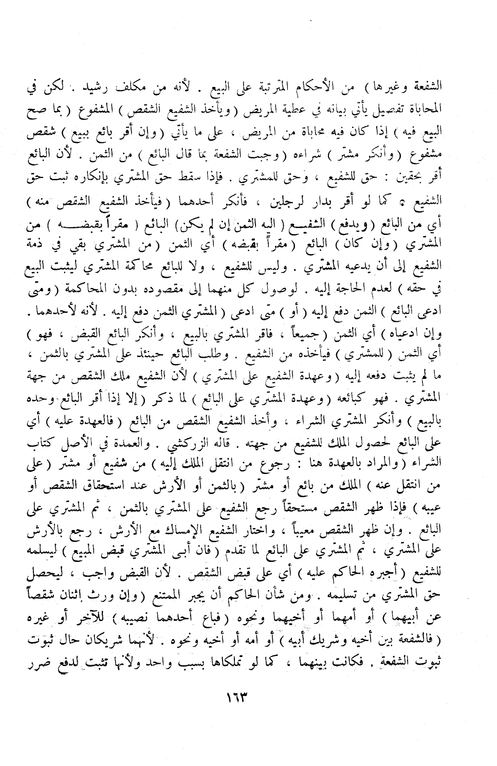الشُّفْعَةِ وَغَيْرِهَا) مِنْ الْأَحْكَامِ الْمُتَرَتِّبَةِ عَلَى الْبَيْعِ؛ لِأَنَّهُ مِنْ مُكَلَّفٍ رَشِيدٍ لَكِنْ فِي الْمُحَابَاةِ تَفْصِيلٌ يَأْتِي بَيَانُهُ فِي عَطِيَّةِ الْمَرِيضِ (وَيَأْخُذُ الشَّفِيعُ الشِّقْصَ) الْمَشْفُوعَ (بِمَا صَحَّ الْبَيْعُ فِيهِ) إذَا كَانَ فِيهِ مُحَابَاةٌ مِنْ الْمَرِيضِ عَلَى مَا يَأْتِي.