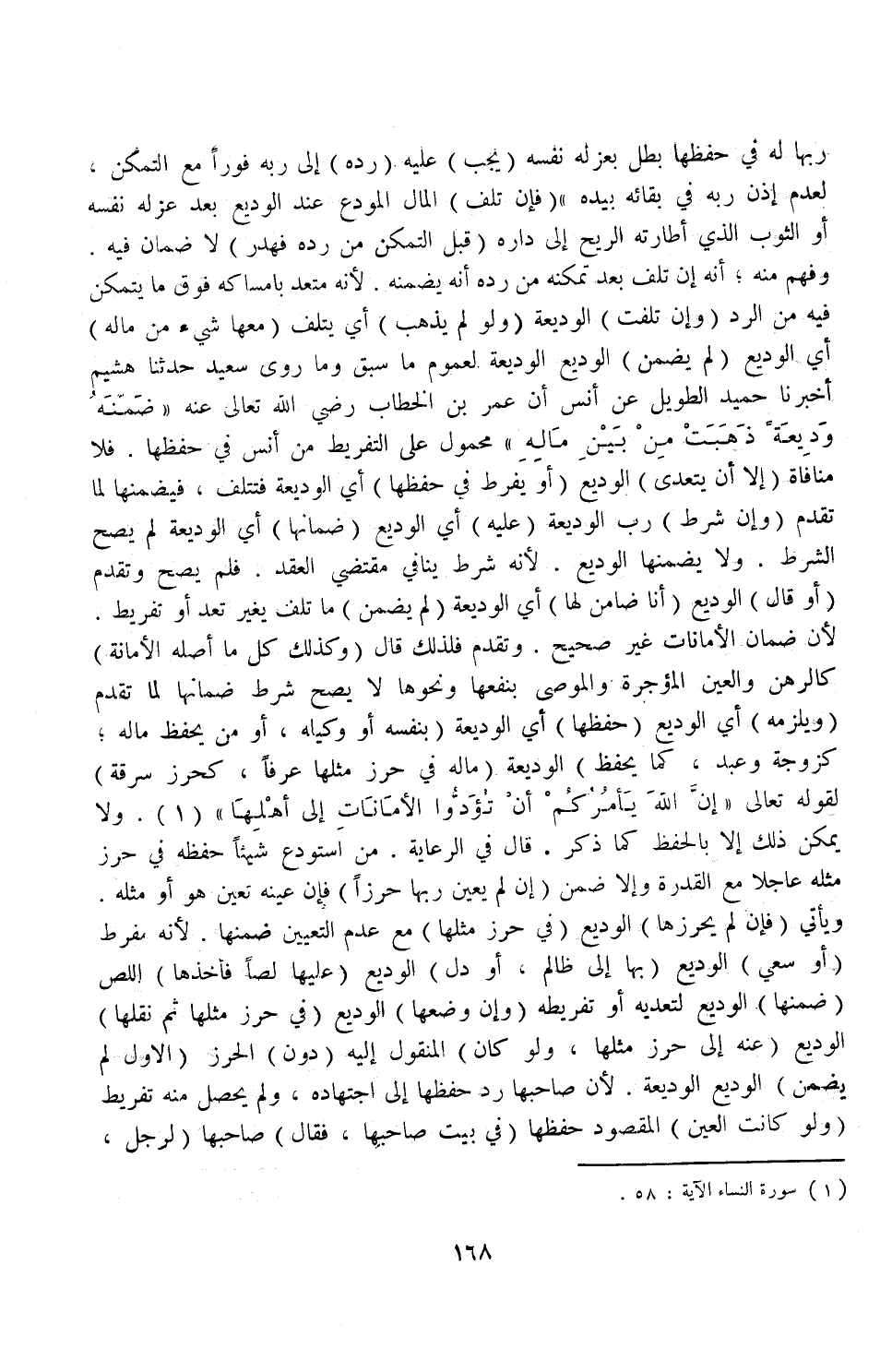 (وَيَلْزَمُهُ) أَيْ: الْوَدِيعَ (حِفْظُهَا) أَيْ: الْوَدِيعَةِ (بِنَفْسِهِ مَثَلًا أَوْ وَكِيلِهِ، أَوْ مَنْ يَحْفَظُ مَالَهُ، كَزَوْجَةٍ وَعَبْدٍ، كَمَا يَحْفَظُ) الْوَدِيعَةَ (مَالَهُ فِي حِرْزِ مِثْلِهَا عُرْفًا، كَحِرْزِ سَرِقَةٍ) لِقَوْلِهِ تَعَالَى {إِنَّ اللَّهَ يَأْمُرُكُمْ أَنْ تُؤَدُّوا الأَمَانَاتِ إِلَى أَهْلِهَا} [النساء: ٥٨] وَلَا يُمْكِنُ ذَلِكَ إلَّا بِالْحِفْظِ كَمَا ذُكِرَ، قَالَ فِي الرِّعَايَةِ مَنْ اسْتَوْدَعَ شَيْئًا حَفِظَهُ فِي حِرْزِ مِثْلِهِ عَاجِلًا مَعَ الْقُدْرَةِ وَإِلَّا ضَمِنَ (إنْ لَمْ يُعَيِّنْ رَبُّهَا حِرْزًا) فَإِنْ عَيَّنَهُ تَعَيَّنَ هُوَ، أَوْ مِثْلُهُ، وَيَأْتِي (فَإِنْ لَمْ يُحْرِزْهَا) الْوَدِيعُ (فِي حِرْزِ مِثْلِهَا) مَعَ عَدَمِ التَّعْيِينِ ضَمِنَهَا؛ لِأَنَّهُ مُفَرِّطٌ (أَوْ سَعَى) الْوَدِيعُ (بِهَا إلَى ظَالِمٍ، أَوْ دَلَّ) الْوَدِيعُ (عَلَيْهَا لِصًّا فَأَخَذَهَا) اللِّصُّ (ضَمِنَهَا) الْوَدِيعُ لِتَعَدِّيهِ، أَوْ تَفْرِيطِهِ (وَإِنْ وَضَعَهَا) الْوَدِيعُ (فِي حِرْزِ مِثْلِهَا ثُمَّ نَقَلَهَا) الْوَدِيعُ (عَنْهُ إلَى حِرْزِ مِثْلِهَا، وَلَوْ كَانَ) الْمَنْقُولُ إلَيْهِ (دُونَ) الْحِرْزِ (الْأَوَّلِ لَمْ يَضْمَنْ) الْوَدِيعُ الْوَدِيعَةَ؛ لِأَنَّ صَاحِبَهَا رَدَّ حِفْظَهَا إلَى اجْتِهَادِهِ وَلَمْ يَحْصُلْ مِنْهُ تَفْرِيطٌ.