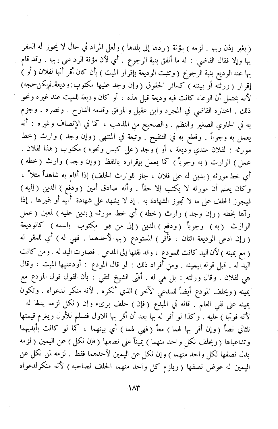 (وَإِنْ وُجِدَ عَلَيْهَا مَكْتُوبٌ: وَدِيعَةٌ لَمْ يَكُنْ حُجَّةً) ؛ لِأَنَّهُ يُحْتَمَلُ أَنَّ الْوِعَاءَ كَانَتْ فِيهِ وَدِيعَةً قَبْلَ هَذِهِ، أَوْ كَانَ وَدِيعَةً لِلْمَيِّتِ عِنْدَ غَيْرِهِ وَنَحْوُ ذَلِكَ اخْتَارَهُ الْقَاضِي فِي الْمُجَرَّدِ وَابْنُ عَقِيلٍ وَالْمُوَفَّقُ وَقَدَّمَهُ الشَّارِحُ وَنَصَرَهُ وَجَزَمَ بِهِ فِي الْحَاوِي الصَّغِيرِ وَالنَّظْمِ وَالصَّحِيحُ مِنْ الْمَذْهَبِ كَمَا فِي الْإِنْصَافِ وَغَيْرِهِ أَنَّهُ يُعْمَلُ بِهِ وُجُوبًا وَقَطَعَ بِهِ فِي التَّنْقِيحِ وَتَبِعَهُ فِي الْمُنْتَهَى.