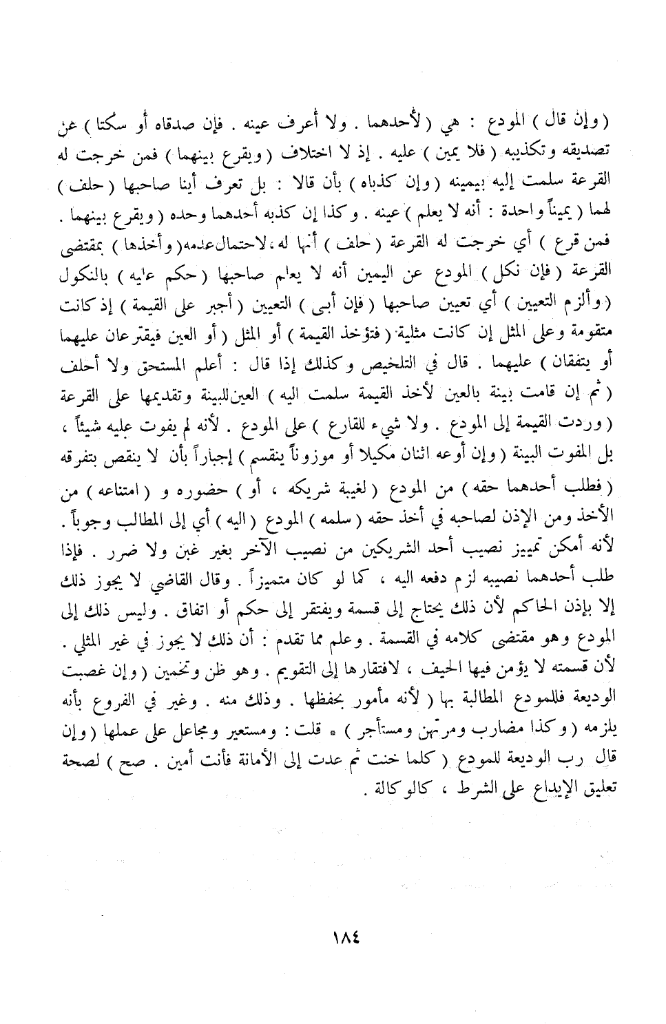 (وَإِنْ أَوَدَعُهُ اثْنَانِ مَكِيلًا مَثَلًا أَوْ مَوْزُونًا يَنْقَسِمُ) إجْبَارًا بِأَنْ لَا يَنْقُصَ بِتَفَرُّقِهِ (فَطَلَبَ أَحَدُهُمَا حَقَّهُ) مِنْ الْمُودَعِ (لِغَيْبَةِ شَرِيكِهِ، أَوْ) حُضُورِهِ وَ (امْتِنَاعِهِ) مِنْ الْأَخْذِ وَمِنْ الْإِذْنِ لِصَاحِبِهِ فِي أَخْذِ حَقِّهِ (سَلَّمَهُ) الْمُودَعُ (إلَيْهِ) أَيْ إلَى الْمُطَالِبِ وُجُوبًا؛ لِأَنَّهُ أَمْكَنَ تَمْيِيزُ نَصِيبِ أَحَدِ الشَّرِيكَيْنِ مِنْ نَصِيبِ الْآخَرِ بِغَيْرِ غَبْنٍ وَلَا ضَرَرٍ فَإِذَا طَلَبَ أَحَدُهُمَا نَصِيبَهُ لَزِمَ دَفْعُهُ إلَيْهِ، كَمَا لَوْ كَانَ مُتَمَيِّزًا وَقَالَ الْقَاضِي لَا يَجُوزُ ذَلِكَ إلَّا بِإِذْنِ الْحَاكِمِ؛ لِأَنَّ ذَلِكَ يَحْتَاجُ إلَى قِسْمَةٍ وَيَفْتَقِرُ إلَى حُكْمٍ أَوْ اتِّفَاقٍ وَلَيْسَ ذَلِكَ إلَى الْمُودَعِ وَهُوَ مُقْتَضَى كَلَامِهِ فِي الْقِسْمَةِ وَعُلِمَ مِمَّا تَقَدَّمَ: أَنَّ ذَلِكَ لَا يَجُوزُ فِي غَيْرِ الْمِثْلِيِّ؛ لِأَنَّ قِسْمَتَهُ لَا يُؤْمَنُ فِيهَا الْحَيْفُ، لِافْتِقَارِهَا إلَى التَّقْوِيمِ وَهُوَ ظَنٌّ وَتَخْمِينٌ.