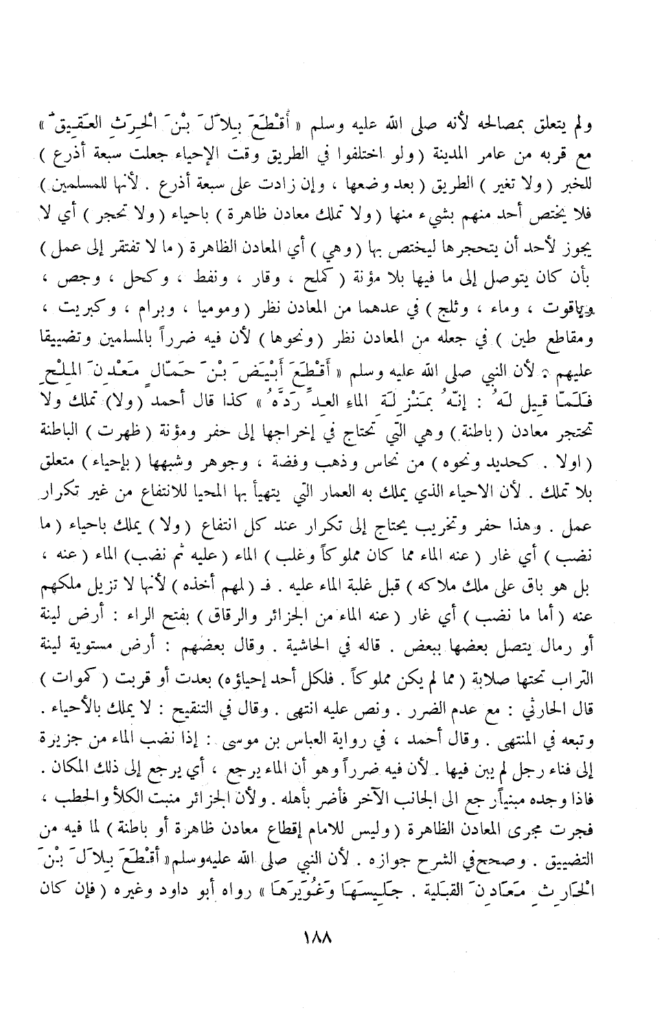 (وَنَحْوِهَا) ؛ لِأَنَّ فِيهِ ضَرَرًا بِالْمُسْلِمِينَ وَتَضْيِيقًا عَلَيْهِمْ «؛ لِأَنَّ النَّبِيَّ - صَلَّى اللَّهُ عَلَيْهِ وَسَلَّمَ - أَقْطَعَ أَبْيَضَ بْنَ حَمَّالٍ مَعْدِنَ الْمِلْحِ فَلَمَّا قِيلَ لَهُ إنَّهُ بِمَنْزِلَةِ الْمَاءِ الْعِدِّ رَدَّهُ» كَذَا قَالَ أَحْمَدُ.