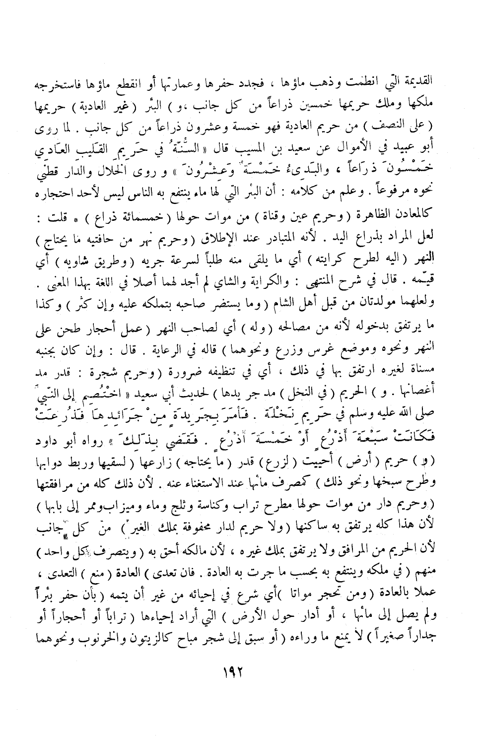 الْقَدِيمَةُ الَّتِي انْطَمَّتْ وَذَهَبَ مَاؤُهَا، فَجُدِّدَ حَفْرُهَا وَعِمَارَتُهَا أَوْ انْقَطَعَ مَاؤُهَا فَاسْتَخْرَجَهُ مَلَكَهَا وَمَلَكَ حَرِيمَهَا خَمْسِينَ ذِرَاعًا مِنْ كُلِّ جَانِبٍ، وَ) الْبِئْرُ (غَيْرُ الْعَادِيَّةِ) حَرِيمُهَا عَلَى النِّصْفِ مِنْ حَرِيمِ الْعَادِيَّةِ فَهُوَ خَمْسَةٌ وَعِشْرُونَ ذِرَاعًا مِنْ كُلِّ جَانِبٍ لِمَا رَوَى أَبُو عُبَيْدٍ فِي الْأَمْوَالِ عَنْ سَعِيدِ بْنِ الْمُسَيِّبِ قَالَ " السُّنَّةُ فِي حَرِيمِ الْقَلِيبِ الْعَادِيِّ خَمْسُونَ ذِرَاعًا وَالْبَدِيءُ خَمْسَةٌ وَعِشْرُونَ " وَرَوَى الْخَلَّالُ وَالدَّارَقُطْنِيّ نَحْوَهُ مَرْفُوعًا وَعُلِمَ مِنْ كَلَامِهِ: أَنَّ الْبِئْرَ الَّتِي لَهَا مَاءٌ يَنْتَفِعُ بِهِ النَّاسُ لَيْسَ لِأَحَدٍ احْتِجَارُهُ كَالْمَعَادِنِ الظَّاهِرَةِ (وَحَرِيمُ عَيْنٍ وَقَنَاةٍ) مِنْ مَوَاتٍ حَوْلَهَا (خَمْسُمِائَةِ ذِرَاعٍ) قُلْتُ: لَعَلَّ الْمُرَادَ بِذِرَاعِ الْيَدِ؛ لِأَنَّهُ الْمُتَبَادَرُ عِنْدَ الْإِطْلَاقِ (وَحَرِيمُ نَهْرٍ مِنْ حَافَتَيْهِ مَا يَحْتَاجُ) النَّهْرُ (إلَيْهِ لِطَرْحِ كِرَايَتِهِ) أَيْ مَا يُلْقَى مِنْهُ طَلَبًا لِسُرْعَةِ جَرْيِهِ.