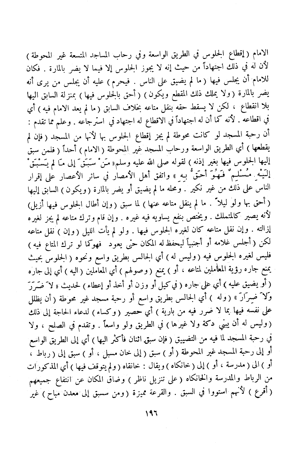 الْإِمَامِ (إقْطَاعُ الْجُلُوسِ فِي الطَّرِيقِ الْوَاسِعَةِ وَفِي رِحَابِ الْمَسَاجِدِ الْمُتَّسِعَةِ غَيْرِ الْمَحُوطَةِ) ؛ لِأَنَّ لَهُ فِي ذَلِكَ اجْتِهَادًا مِنْ حَيْثُ إنَّهُ لَا يَجُوزُ الْجُلُوسُ إلَّا فِيمَا لَا يَضُرُّ بِالْمَارَّةِ فَكَانَ لِلْإِمَامِ أَنْ يُجْلِسَ فِيهَا (مَا لَمْ يُضَيِّقْ عَلَى النَّاسِ فَيُحَرَّمُ) عَلَيْهِ أَنْ يُجْلِسَ مَنْ يَرَى أَنَّهُ يَضُرُّ بِالْمَارَّةِ.