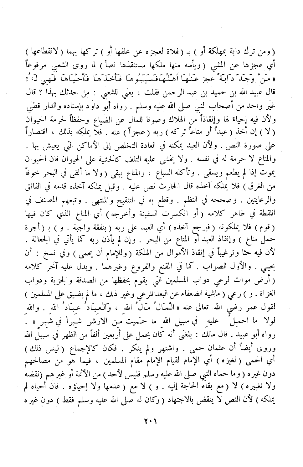 وَرُوِيَ أَيْضًا أَنَّ عُثْمَانَ حَمَى، وَاشْتَهَرَ، وَلَمْ يُنْكَرْ فَكَانَ كَالْإِجْمَاعِ (لَيْسَ ذَلِكَ) أَيْ: الْحِمَى (لِغَيْرِهِ) أَيْ: الْإِمَامِ لِقِيَامِ الْإِمَامِ مَقَامَ الْمُسْلِمِينَ، فِيمَا هُوَ مِنْ مَصَالِحِهِمْ دُونَ غَيْرِهِ.