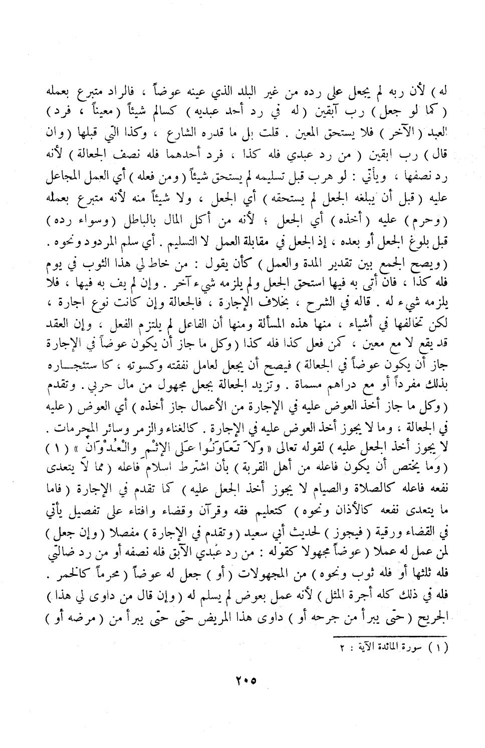 (وَكُلّ مَا جَازَ أَخْذُ الْعِوَضِ عَلَيْهِ فِي الْإِجَارَةِ مِنْ الْأَعْمَالِ جَازَ أَخْذُهُ) أَيْ: الْعِوَضِ (عَلَيْهِ فِي الْجَعَالَةِ، وَمَا لَا يَجُوزُ أَخْذُ الْعِوَضِ عَلَيْهِ فِي الْإِجَارَةِ كَالْغِنَاءِ، وَالزَّمْرِ، وَسَائِرِ الْمُحَرَّمَاتِ لَا يَجُوزُ أَخْذُ الْجُعْلِ عَلَيْهِ) لِقَوْلِهِ تَعَالَى {وَلا تَعَاوَنُوا عَلَى الإِثْمِ وَالْعُدْوَانِ} [المائدة: ٢] .