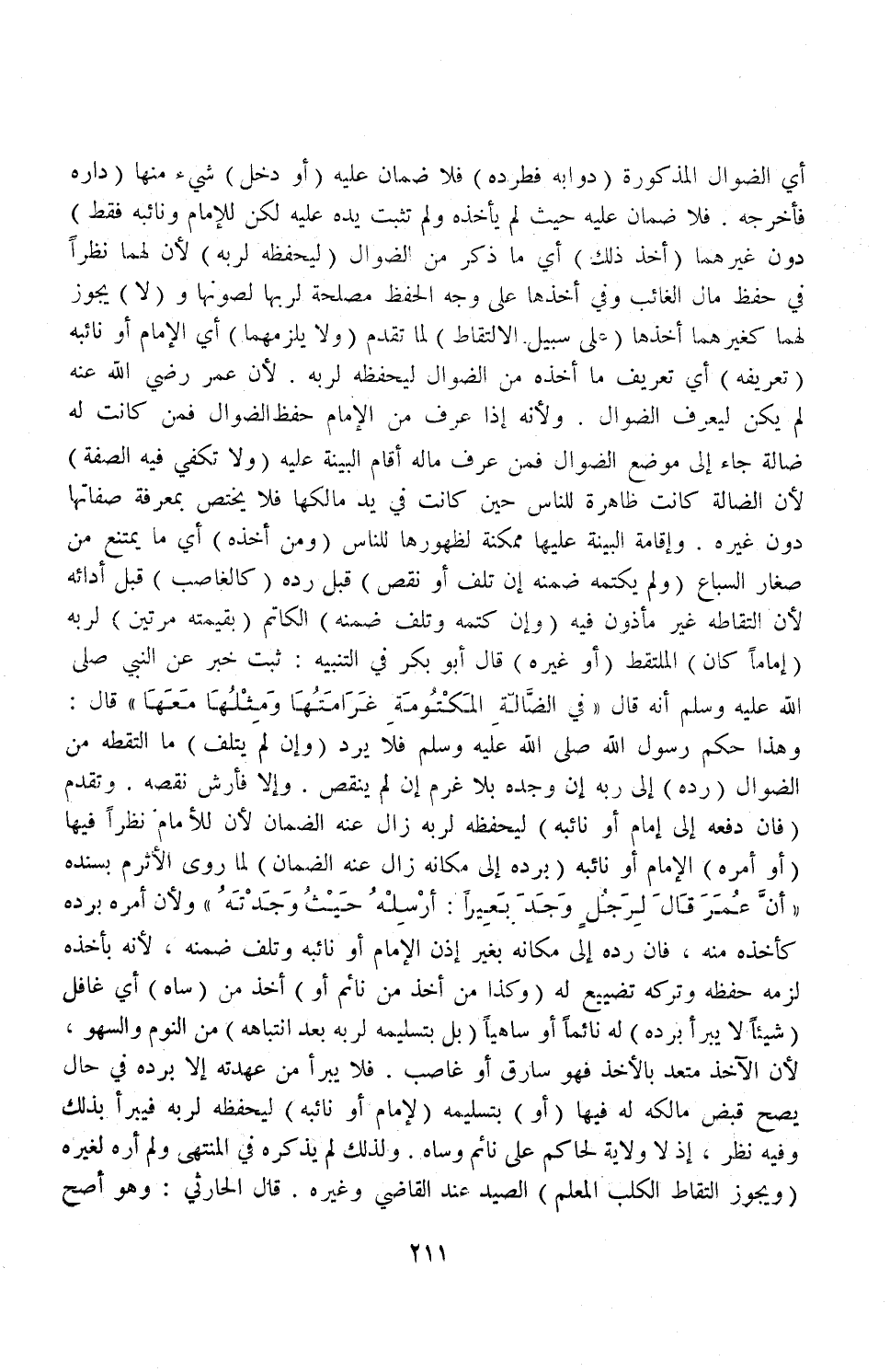(مَثَلًا وَلَا يَلْزَمُهُمَا) أَيْ: الْإِمَامَ أَوْ نَائِبَهُ (تَعْرِيفُهُ) أَيْ: تَعْرِيفُ مَا أَخَذَهُ مِنْ الضَّوَالِّ لِيَحْفَظَهُ لِرَبِّهِ؛ لِأَنَّ عُمَرَ - رَضِيَ اللَّهُ عَنْهُ - لَمْ يَكُنْ لِيُعَرِّفَ الضَّوَالَّ؛ وَلِأَنَّهُ إذَا عُرِفَ مِنْ الْإِمَامِ حِفْظُ الضَّوَالِّ فَمَنْ كَانَتْ لَهُ ضَالَّةٌ جَاءَ إلَى مَوْضِعِ الضَّوَالِّ فَمَنْ عَرَفَ مَالَهُ أَقَامَ الْبَيِّنَةَ عَلَيْهِ (وَلَا تَكْفِي فِيهِ الصِّفَةُ) ؛ لِأَنَّ الضَّالَّةَ كَانَتْ ظَاهِرَةً لِلنَّاسِ حِينَ كَانَتْ فِي يَدِ مَالِكِهَا فَلَا يَخْتَصُّ بِمَعْرِفَةِ صِفَاتِهَا دُونَ غَيْرِهِ، وَإِقَامَةُ الْبَيِّنَةِ عَلَيْهَا مُمْكِنَةٌ لِظُهُورِهَا لِلنَّاسِ.