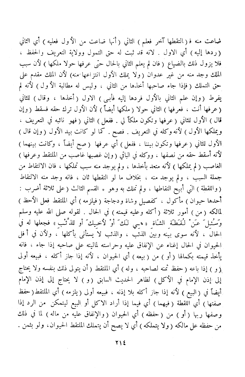 (وَاللُّقَطَةُ) الَّتِي أُبِيحَ الْتِقَاطُهَا وَلَمْ تُمْلَكْ بِهِ، وَهُوَ الْقِسْمُ الثَّالِثُ (عَلَى ثَلَاثَةِ أَضْرُبٍ: أَحَدُهَا حَيَوَانٌ) مَأْكُولٌ، كَفَصِيلٍ، وَشَاةٍ، وَدَجَاجَةٍ (فَيَلْزَمُهُ) أَيْ: الْمُلْتَقِطَ فِعْلُ الْأَحَظِّ لِمَالِكِهِ (مِنْ) أُمُورٍ ثَلَاثَةٍ (أَكْلُهُ، وَعَلَيْهِ قِيمَتُهُ) فِي الْحَالِ لِقَوْلِهِ - صَلَّى اللَّهُ عَلَيْهِ وَسَلَّمَ - «وَسُئِلَ عَنْ لُقَطَةِ الشَّاةِ هِيَ لَك أَوْ لِأَخِيك أَوْ لِلذِّئْبِ» فَجَعَلَهَا لَهُ فِي الْحَالِ؛ لِأَنَّهُ سَوَّى بَيْنَهُ، وَبَيْنَ الذِّئْبِ، وَالذِّئْبُ لَا يُسْتَأْنَى بِأَكْلِهَا؛ وَلِأَنَّ فِي أَكْلِ الْحَيَوَانِ فِي الْحَالِ إغْنَاءً عَنْ الْإِنْفَاقِ عَلَيْهِ، وَحِرَاسَتِهِ لِمَالِيَّتِهِ عَلَى صَاحِبِهِ إذَا جَاءَ، فَإِنَّهُ يَأْخُذُ قِيمَتَهُ بِكَمَالِهَا (أَوْ) مِنْ (بَيْعِهِ) أَيْ: الْحَيَوَانِ؛ لِأَنَّهُ إذَا جَازَ أَكْلُهُ، فَبَيْعُهُ أَوْلَى.