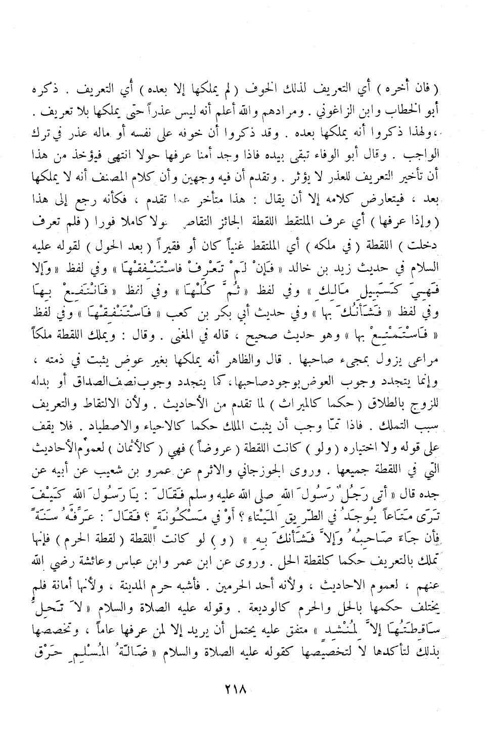 يُحْتَمَلُ أَنْ يُرِيدَ إلَّا لِمَنْ عَرَّفَهَا عَامًا، وَتَخَصُّصُهَا بِذَلِكَ لِتَأَكُّدِهَا لَا لِتَخْصِيصِهَا كَقَوْلِهِ - عَلَيْهِ الصَّلَاةُ وَالسَّلَامُ - «ضَالَّةُ الْمُسْلِمِ حَرْقُ