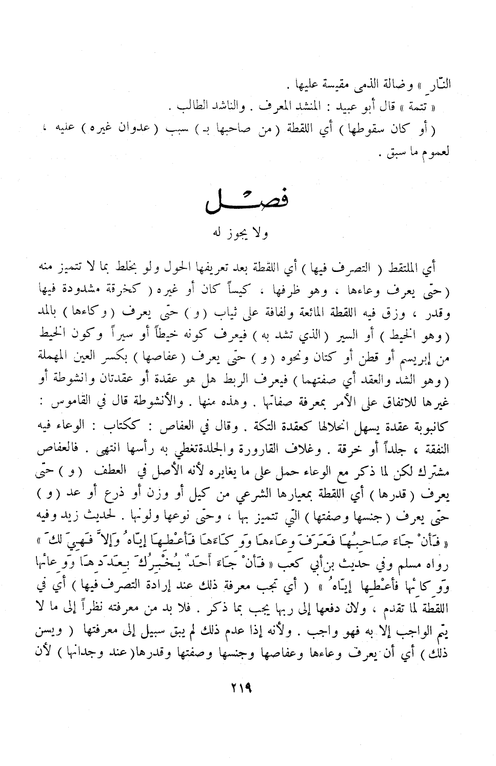 فَصْلٌ وَلَا يَجُوزُ لَهُ أَيْ: الْمُلْتَقِطِ (التَّصَرُّفُ فِيهَا) أَيْ: اللُّقَطَةِ بَعْدَ تَعْرِيفِهَا الْحَوْلَ وَلَوْ بِخَلْطٍ بِمَا لَا تَتَمَيَّزُ مِنْهُ (حَتَّى يَعْرِفَ وِعَاءَهَا، وَهُوَ ظَرْفُهَا، كِيسًا كَانَ أَوْ غَيْرَهُ) كَخِرْقَةٍ مَشْدُودَةٍ فِيهَا وَقِدْرٍ، وَزِقٍّ فِيهِ اللُّقَطَةُ الْمَائِعَةُ وَلُفَافَةٌ عَلَى ثِيَابٍ (وَ) حَتَّى يُعَرِّفَ (وِكَاءَهَا) بِالْمَدِّ (وَهُوَ الْخَيْطُ) أَوْ السَّيْرُ (الَّذِي تُشَدُّ بِهِ) فَيُعَرِّفُ كَوْنَهُ خَيْطًا أَوْ سَيْرًا، وَكَوْنُ الْخَيْطِ مِنْ إبْرَيْسَمٍ أَوْ قُطْنٍ أَوْ كَتَّانٍ، وَنَحْوِهِ (وَ) حَتَّى يُعَرِّفَ (عِفَاصَهَا) بِكَسْرِ الْعَيْنِ الْمُهْمَلَةِ (وَهُوَ الشَّدُّ، وَالْعَقْدُ أَيْ: صِفَتُهُمَا) فَيُعَرِّفَ الرَّبْطَ هَلْ هُوَ عُقْدَةٌ أَوْ عُقْدَتَانِ، وَأُنْشُوطَةٌ أَوْ غَيْرُهَا لِلِاتِّفَاقِ عَلَى الْأَمْرِ بِمَعْرِفَةِ صِفَاتِهَا، وَهَذِهِ مِنْهَا.