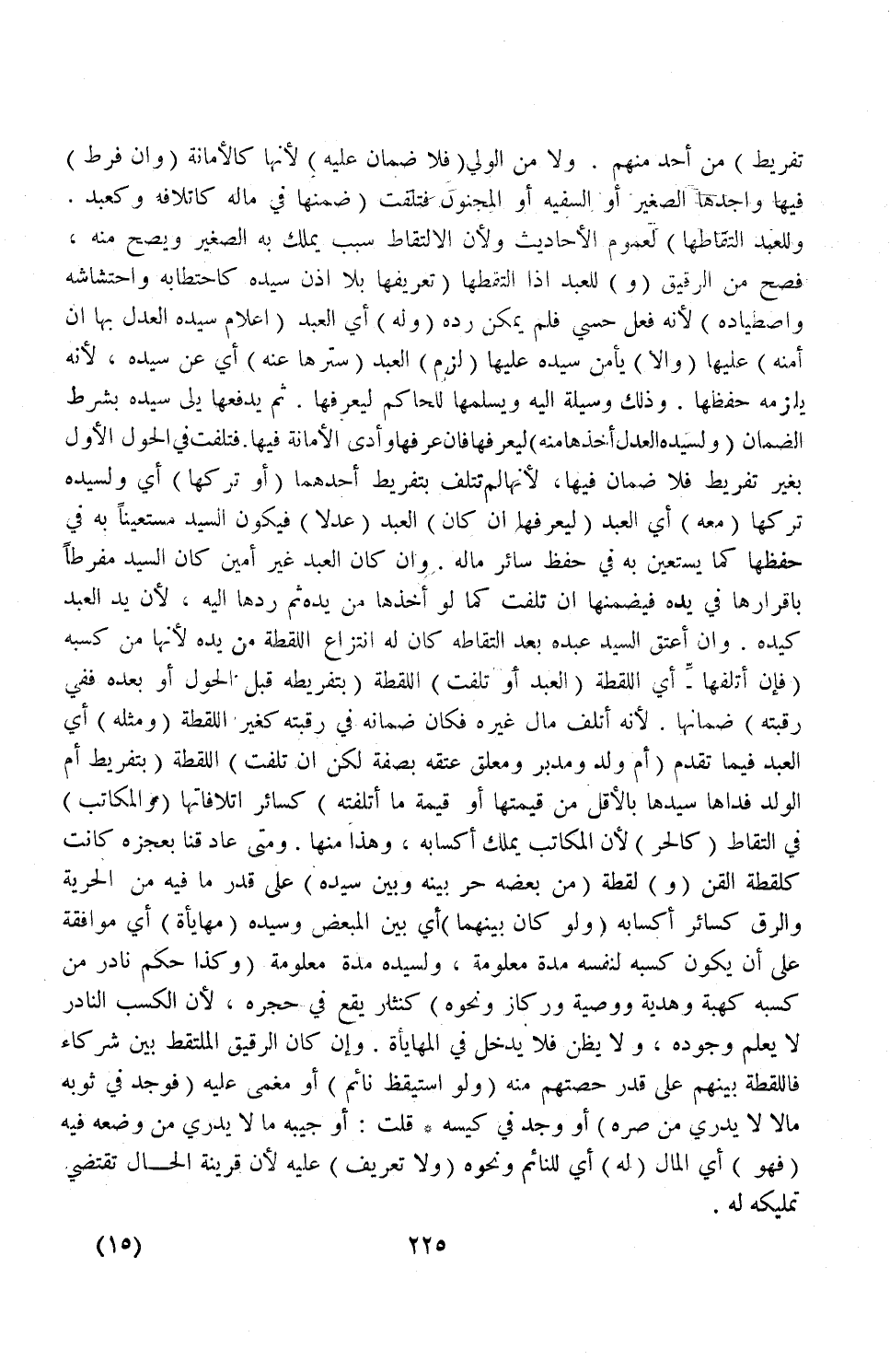 (وَلِلْعَبْدِ الْتِقَاطُهَا) لِعُمُومِ الْأَحَادِيثِ؛ وَلِأَنَّ الِالْتِقَاطَ سَبَبٌ يَمْلِكُ بِهِ الصَّغِيرُ، وَيَصِحُّ مِنْهُ، فَصَحَّ مِنْ الرَّقِيقِ.