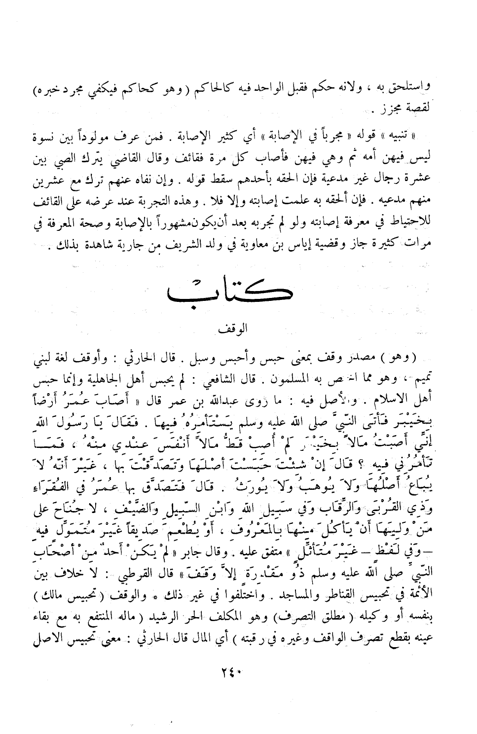 وَقَالَ جَابِرٌ " لَمْ يَكُنْ مِنْ أَحَدٍ مِنْ أَصْحَابِ النَّبِيِّ - صَلَّى اللَّهُ عَلَيْهِ وَسَلَّمَ - ذُو مَقْدِرَةٍ إلَّا وَقَفَ قَالَ الْقُرْطُبِيُّ: لَا خِلَافَ بَيْنَ الْأَئِمَّةِ فِي تَحْبِيسِ الْقَنَاطِرِ وَالْمَسَاجِدِ وَاخْتَلَفُوا فِي غَيْرِ ذَلِكَ وَالْوَقْفُ (تَحْبِيسُ مَالِكٍ) بِنَفْسِهِ أَوْ وَكِيلِهِ (مُطْلَقِ التَّصَرُّفِ) وَهُوَ الْمُكَلَّفُ الْحُرُّ الرَّشِيدُ (مَالَهُ الْمُنْتَفَعَ بِهِ مَعَ بَقَاءِ عَيْنِهِ بِقَطْعِ تَصَرُّفِ الْوَاقِفِ وَغَيْرِهِ فِي رَقَبَتِهِ) أَيْ الْمَالِ.
