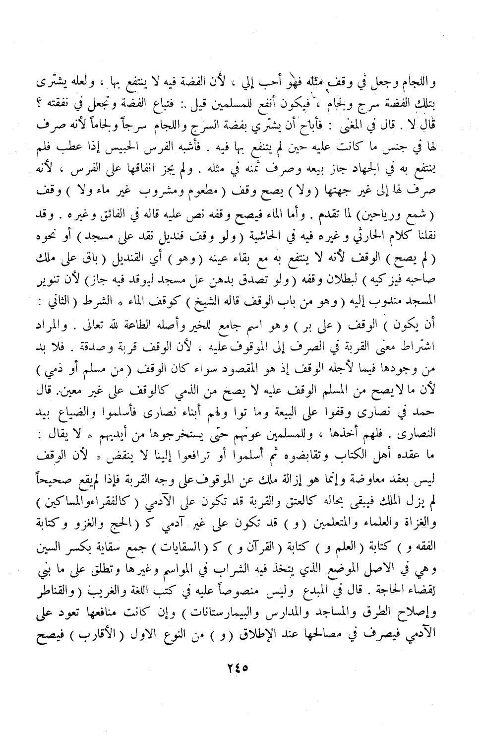 (وَ) قَدْ تَكُونُ عَلَى غَيْرِ آدَمِيٍّ ك (الْحَجِّ، وَالْغَزْوِ، وَكِتَابَةِ الْفِقْهِ وَ) كِتَابَةِ (الْعِلْمِ وَ) كِتَابَةِ (الْقُرْآنِ وَ) ك (السِّقَايَاتِ) جَمْعُ سِقَايَةٍ بِكَسْرِ السِّينِ، وَهِيَ فِي الْأَصْلِ الْمَوْضِعُ الَّذِي يُتَّخَذُ فِيهِ الشَّرَابُ فِي الْمَوَاسِمِ، وَغَيْرِهَا، وَتُطْلَقُ عَلَى مَا بُنِيَ لِقَضَاءِ الْحَاجَةِ قَالَ فِي الْمُبْدِعِ وَلَيْسَ مَنْصُوصًا عَلَيْهِ فِي كُتُبِ اللُّغَةِ، وَالْغَرِيبِ (وَالْقَنَاطِرِ، وَإِصْلَاحِ الطُّرُقِ، وَالْمَسَاجِدِ، وَالْمَدَارِسِ والبيمارستانات نَاتِ، وَ) إنْ كَانَتْ مَنَافِعُهَا تَعُودُ عَلَى الْآدَمِيِّ فَيُصْرَفُ فِي مَصَالِحِهَا عِنْدَ الْإِطْلَاقِ وَمِنْ النَّوْعِ الْأَوْلِ (الْأَقَارِبُ) فَيَصِحُّ
