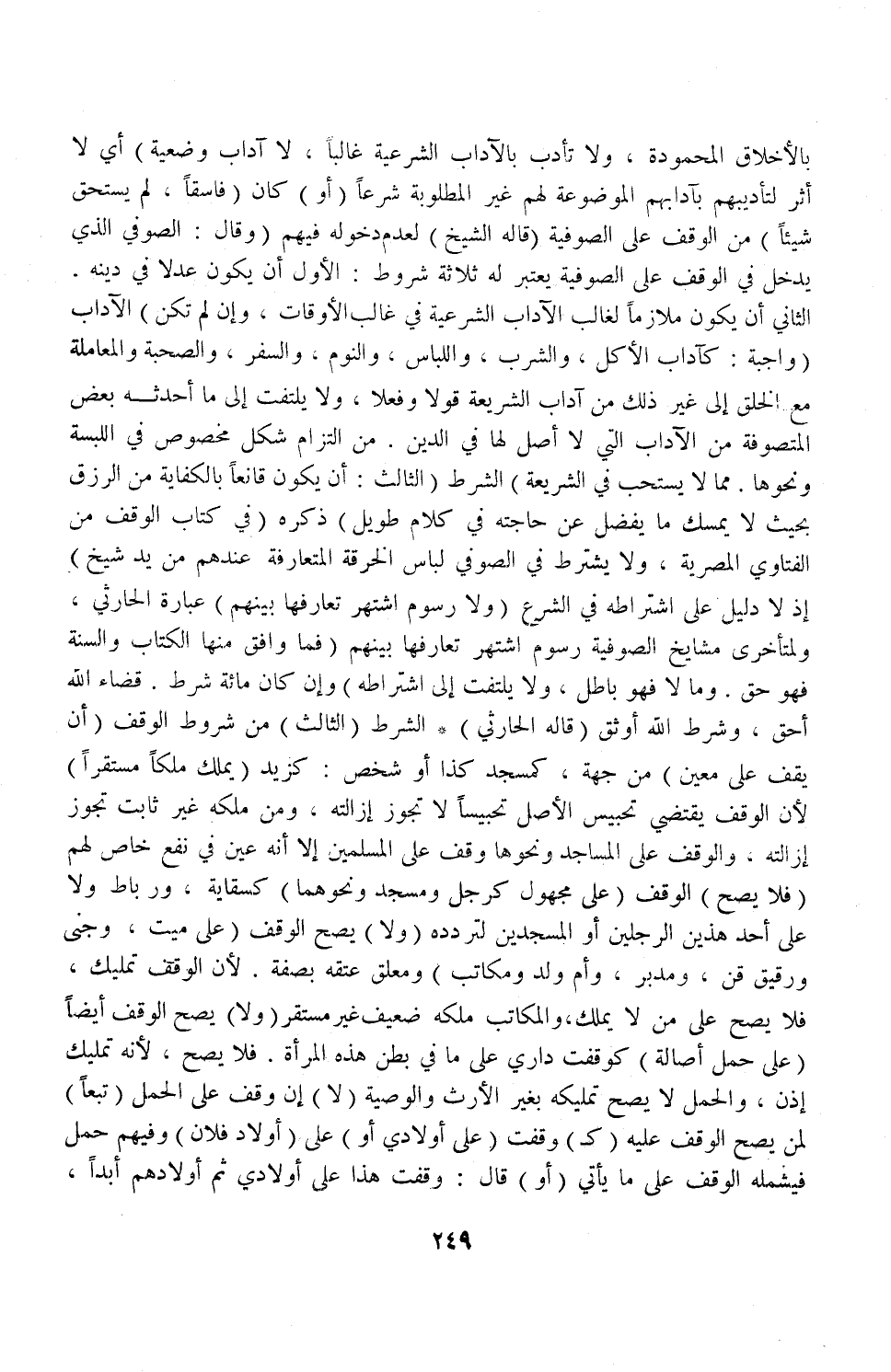 (وَقَالَ: الصُّوفِيُّ الَّذِي يَدْخُلُ فِي الْوَقْفِ عَلَى الصُّوفِيَّةِ يُعْتَبَرُ لَهُ ثَلَاثَةُ شُرُوطٍ: الْأَوَّلُ أَنْ يَكُونَ عَدْلًا فِي دِينِهِ الثَّانِي أَنْ يَكُونَ مُلَازِمًا لِغَالِبِ الْآدَابِ الشَّرْعِيَّةِ فِي غَالِبِ الْأَوْقَاتِ، وَإِنْ لَمْ تَكُنْ) الْآدَابُ (وَاجِبَةً: كَآدَابِ الْأَكْلِ، وَالشُّرْبِ، وَاللِّبَاسِ، وَالنَّوْمِ، وَالسَّفَرِ، وَالصُّحْبَةِ، وَالْمُعَامَلَةِ مَعَ الْخَلْقِ إلَى غَيْرِ ذَلِكَ مِنْ آدَابِ الشَّرِيعَةِ قَوْلًا، وَفِعْلًا وَلَا يُلْتَفَتُ إلَى مَا أَحْدَثَهُ بَعْضُ الْمُتَصَوِّفَةِ مِنْ الْآدَابِ الَّتِي لَا أَصْلَ لَهَا فِي الدِّينِ مِنْ الْتِزَامِ شَكْلٍ مَخْصُوصٍ فِي اللُّبْسَةِ، وَنَحْوِهَا مِمَّا لَا يُسْتَحَبُّ فِي الشَّرِيعَةُ) الشَّرْطُ (الثَّالِثُ: أَنْ يَكُونَ قَانِعًا بِالْكِفَايَةِ مِنْ الرِّزْقِ بِحَيْثُ لَا يُمْسِكُ مَا يَفْضُلُ عَنْ حَاجَتِهِ فِي كَلَامٍ طَوِيلٍ) ذَكَرَهُ (فِي كِتَابِ الْوَقْفِ مِنْ الْفَتَاوَى الْمِصْرِيَّةِ وَلَا يُشْتَرَطُ فِي الصُّوفِيِّ لِبَاسُ الْخِرْقَةِ الْمُتَعَارَفَةِ عِنْدَهُمْ مِنْ يَدِ شَيْخٍ) إذْ لَا دَلِيلَ عَلَى اشْتِرَاطِهِ فِي الشَّرْعِ.