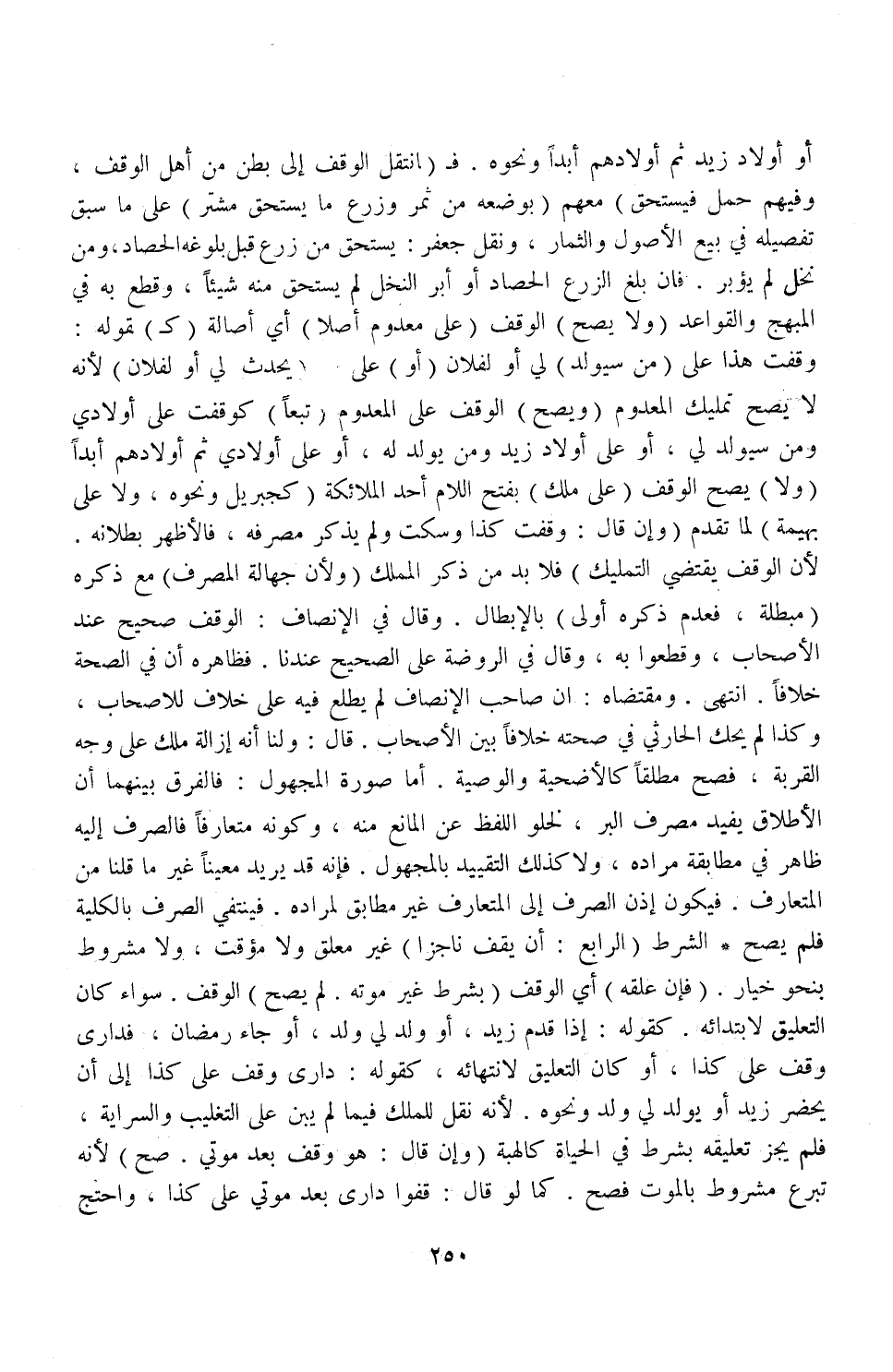 (وَلَا يَصِحُّ) الْوَقْفُ (عَلَى مَعْدُومٍ أَصْلًا) أَيْ: أَصَالَةً (ك) قَوْلِهِ: وَقَفْتُ هَذَا عَلَى (مَنْ سَيُولَدُ) لِي أَوْ لِفُلَانٍ (أَوْ) عَلَى مَنْ (يَحْدُثُ لِي أَوْ لِفُلَانٍ) ؛ لِأَنَّهُ لَا يَصِحُّ تَمْلِيكُ الْمَعْدُومِ (وَيَصِحُّ) الْوَقْفُ عَلَى الْمَعْدُومِ (تَبَعًا) كَوَقَفْتُ عَلَى أَوْلَادِي، وَمَنْ سَيُولَدُ لِي، أَوْ عَلَى أَوْلَادِ زَيْدٍ، وَمَنْ يُولَدُ لَهُ، أَوْ عَلَى أَوْلَادِي ثُمَّ أَوْلَادِهِمْ أَبَدًا.