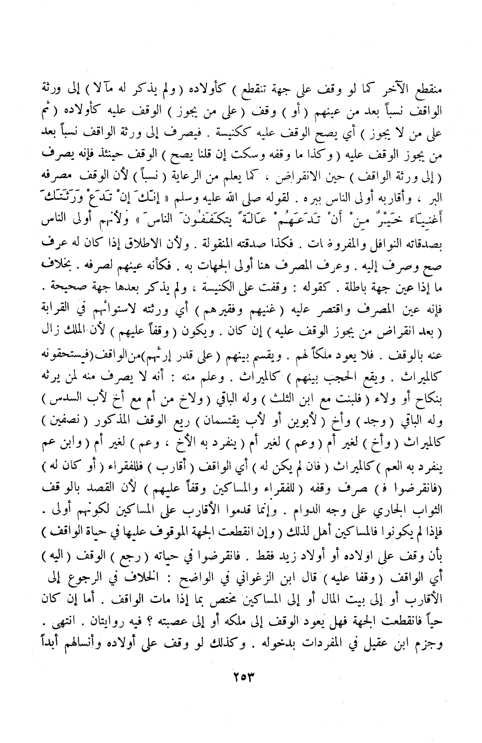 ، وَعَلِمَ مِنْهُ أَنَّهُ لَا يُصْرَفُ مِنْهُ لِمَنْ يَرِثُهُ بِنِكَاحٍ أَوْ وَلَاءٍ (فَلِبِنْتٍ مَعَ ابْنٍ الثُّلُثُ) وَلَهُ الْبَاقِي (وَلِأَخٍ مِنْ أُمٍّ مَعَ أَخٍ لِأَبٍ السُّدْسُ) وَلَهُ الْبَاقِي (وَجَدٍّ) ، وَأَخٍ (لِأَبَوَيْنِ أَوْ لِأَبٍ يَقْتَسِمَانِ) رِيعَ الْوَقْفِ الْمَذْكُورِ (نِصْفَيْنِ) كَالْمِيرَاثِ (وَأَخٍ) لِغَيْرِ أُمٍّ (وَعَمٍّ) لِغَيْرِ أُمٍّ (يَنْفَرِدُ بِهِ الْأَخُ، وَعَمٍّ) لِغَيْرِ أُمٍّ (وَابْنِ عَمٍّ يَنْفَرِدُ بِهِ الْعَمُّ) كَالْمِيرَاثِ (فَإِنْ لَمْ يَكُنْ لَهُ) أَيْ: الْوَاقِفِ (أَقَارِبٌ) فَلِلْفُقَرَاءِ (أَوْ كَانَ لَهُ فَانْقَرَضُوا ف) صَرْفُ وَقْفِهِ (لِلْفُقَرَاءِ، وَالْمَسَاكِينِ وَقْفًا عَلَيْهِمْ) ؛ لِأَنَّ الْقَصْدَ بِالْوَقْفِ الثَّوَابُ الْجَارِي عَلَى وَجْهِ الدَّوَامِ، وَإِنَّمَا قَدَّمُوا الْأَقَارِبَ عَلَى الْمَسَاكِينِ لِكَوْنِهِمْ أَوْلَى فَإِذَا لَمْ يَكُونُوا فَالْمَسَاكِينُ أَهْلٌ لِذَلِكَ.