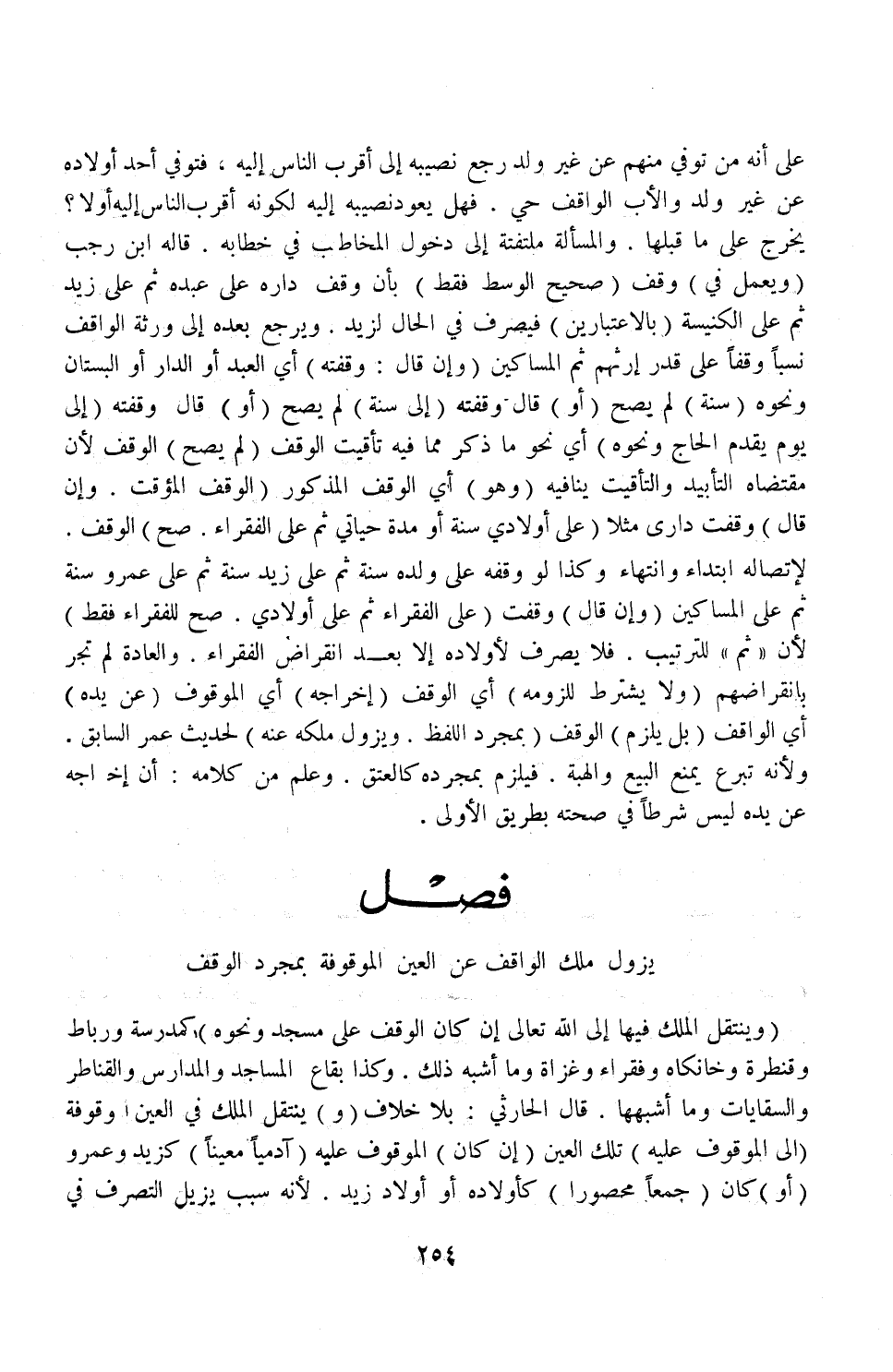 (فَصْلٌ يَزُولُ مِلْكُ الْوَاقِفِ عَنْ الْعَيْنِ الْمَوْقُوفَةِ) بِمُجَرَّدِ الْوَقْفِ (الْوَقْفُ وَيَنْتَقِلُ الْمِلْكُ فِيهَا إلَى اللَّهِ تَعَالَى إنْ كَانَ الْوَقْفُ عَلَى مَسْجِدٍ مَثَلًا وَنَحْوِهِ) كَمَدْرَسَةٍ وَرِبَاطٍ، وَقَنْطَرَةٍ، وَخَانِكَاهٍ، وَفُقَرَاء، وَغُزَاةٍ، وَمَا أَشْبَهَ ذَلِكَ، وَكَذَا بِقَاعُ الْمَسَاجِدِ، وَالْمَدَارِسِ، وَالْقَنَاطِرِ، وَالسِّقَايَاتِ، وَمَا أَشْبَهَهَا قَالَ الْحَارِثِيُّ: بِلَا خِلَافٍ (وَ) يَنْتَقِلُ الْمِلْكُ فِي الْعَيْنِ الْمَوْقُوفَةِ (إلَى الْمَوْقُوفِ عَلَيْهِ) تِلْكَ الْعَيْنُ (إنْ كَانَ) الْمَوْقُوفُ عَلَيْهِ (آدَمِيًّا مُعَيَّنًا) كَزَيْدٍ، وَعَمْرٍو (أَوْ) كَانَ (جَمْعًا مَحْصُورًا) كَأَوْلَادِهِ أَوْ أَوْلَادِ زَيْدٍ؛ لِأَنَّهُ سَبَبٌ يُزِيلُ التَّصَرُّفَ فِي