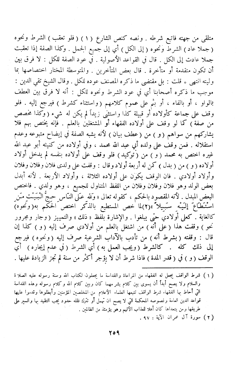 وَقَالَ الشَّيْخُ تَقِيُّ الدِّينِ: مُوجِبُ مَا ذَكَرَهُ أَصْحَابُنَا أَيْ: فِي عَوْدِ الشَّرْطِ، وَنَحْوِهِ لِلْكُلِّ أَنَّهُ لَا فَرْقَ بَيْنَ الْعَطْفِ بِالْوَاوِ، أَوْ بِالْفَاءِ، أَوْ بِثُمَّ عَلَى عُمُومِ كَلَامِهِمْ (وَاسْتِثْنَاءٌ كَشَرْطٍ) فَيُرْجَعُ إلَيْهِ فَلَوْ وَقَفَ عَلَى جَمَاعَةٍ كَأَوْلَادِهِ أَوْ قَبِيلَةِ كَذَا مَثَلًا وَاسْتَثْنَى زَيْدًا لَمْ يَكُنْ لَهُ شَيْءٌ.