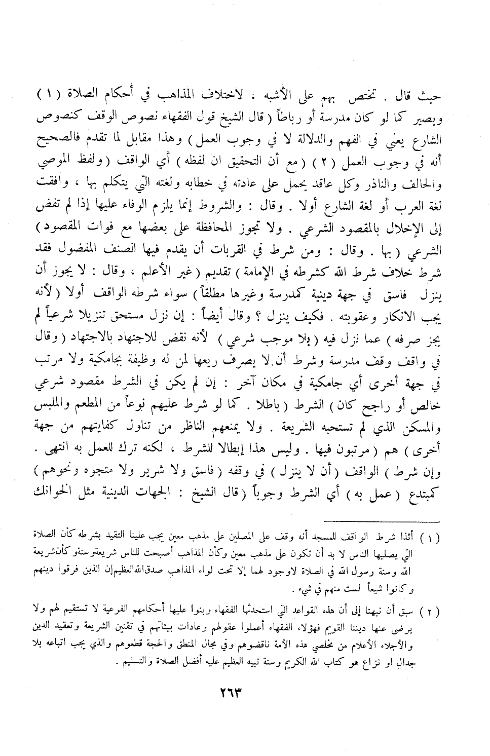 (قَالَ الشَّيْخُ قَوْلُ الْفُقَهَاءِ نُصُوصُ الْوَقْفِ كَنُصُوصِ الشَّارِعِ يَعْنِي فِي الْفَهْمِ، وَالدَّلَالَةِ لَا فِي وُجُوبِ الْعَمَلِ) ، وَهَذَا مُقَابِلٌ لِمَا تَقَدَّمَ فَالصَّحِيحُ أَنَّهُ فِي وُجُوبِ الْعَمَلِ (مَعَ أَنَّ التَّحْقِيقَ أَنَّ لَفْظَهُ) أَيْ: الْوَاقِفِ (وَلَفْظَ الْمُوصِي، وَالْحَالِفِ، وَالنَّاذِرِ، وَكُلِّ عَاقِدٍ يُحْمَلُ عَلَى عَادَتِهِ فِي خِطَابِهِ وَلُغَتِهِ الَّتِي يَتَكَلَّمُ بِهَا، وَافَقَتْ لُغَةَ الْعَرَبِ أَوْ لُغَةَ الشَّارِعِ أَوْ لَا وَقَالَ:، وَالشُّرُوطُ إنَّمَا يَلْزَمُ الْوَفَاءُ عَلَيْهَا إذَا لَمْ تُفْضِ إلَى الْإِخْلَالِ بِالْمَقْصُودِ الشَّرْعِيِّ وَلَا تَجُوزُ الْمُحَافَظَةُ عَلَى بَعْضِهَا مَعَ فَوَاتِ الْمَقْصُودِ) الشَّرْعِيِّ (بِهَا وَقَالَ: وَمَنْ شَرَطَ فِي الْقُرُبَاتِ أَنْ يُقَدِّمَ فِيهَا الصِّنْفَ الْمَفْضُولَ فَقَدْ شَرَطَ خِلَافَ شَرْطِ اللَّهِ كَشَرْطِهِ فِي الْإِمَامَةِ تَقْدِيمَ غَيْرِ الْأَعْلَمِ وَقَالَ: لَا يَجُوزُ أَنْ يَنْزِلَ فَاسِقٌ فِي جِهَةٍ دِينِيَّةٍ كَمَدْرَسَةٍ، وَغَيْرِهَا مُطْلَقًا) سَوَاءٌ شَرَطَهُ الْوَاقِفُ أَوْ لَا (؛ لِأَنَّهُ يَجِبُ الْإِنْكَارُ، وَعُقُوبَتُهُ، فَكَيْفَ يَنْزِلُ وَقَالَ أَيْضًا: إنْ نَزَلَ مُسْتَحِقٌّ تَنْزِيلًا شَرْعِيًّا لَمْ يَجُزْ صَرْفُهُ) عَمَّا نَزَلَ فِيهِ (بِلَا مُوجِبٍ شَرْعِيٍّ؛ لِأَنَّهُ نَقْضٌ لِلِاجْتِهَادِ بِالِاجْتِهَادِ وَقَالَ فِي وَاقِفٍ وَقَفَ مَدْرَسَةً مَدْرَسَةً وَشَرَطَ أَنْ لَا يُصْرَفَ رِيعُهَا لِمَنْ لَهُ مَثَلًا وَظِيفَةٌ بِجَامِكِيَّةٍ وَلَا مُرَتَّبٌ فِي جِهَةٍ أُخْرَى أَيْ: جَامَكِيَّةٌ فِي مَكَان آخَرَ: إنْ لَمْ يَكُنْ فِي الشَّرْطِ مَقْصُودٌ شَرْعِيٌّ خَالِصٌ أَوْ رَاجِحٌ كَانَ) الشَّرْطُ (بَاطِلًا كَمَا لَوْ شَرَطَ عَلَيْهِمْ نَوْعًا مِنْ الْمَطْعَمِ، وَالْمَلْبَسِ، وَالْمَسْكَنِ الَّذِي لَمْ تَسْتَحِبَّهُ الشَّرِيعَةُ وَلَا يَمْنَعُهُمْ النَّاظِرُ مِنْ تَنَاوُل كِفَايَتِهِمْ مِنْ جِهَةٍ أُخْرَى) .