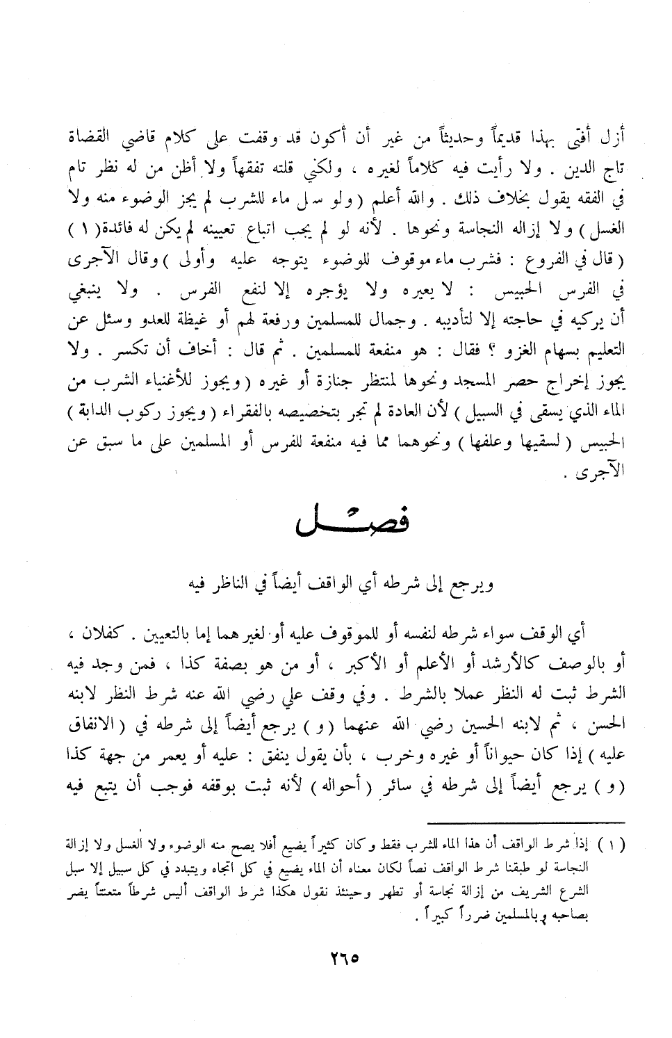 ، (فَصْلٌ وَيُرْجَعُ إلَى شَرْطِهِ أَيْ: الْوَاقِفِ أَيْضًا فِي النَّاظِرِ فِيهِ) أَيْ: الْوَقْفِ سَوَاءٌ شَرَطَهُ لِنَفْسِهِ أَوْ لِلْمَوْقُوفِ عَلَيْهِ أَوْ لِغَيْرِهِمَا إمَّا بِالتَّعْيِينِ كَفُلَانٍ، أَوْ بِالْوَصْفِ كَالْأَرْشَدِ أَوْ الْأَعْلَمِ أَوْ الْأَكْبَرِ، أَوْ مَنْ هُوَ بِصِفَةِ كَذَا، فَمَنْ وُجِدَ فِيهِ الشَّرْطُ ثَبَتَ لَهُ النَّظَرُ عَمَلًا بِالشَّرْطِ، وَفِي وَقْفِ عَلِيٍّ - رَضِيَ اللَّهُ عَنْهُ - شَرَطَ النَّظَرَ لِابْنِهِ الْحَسَنِ، ثُمَّ لِابْنِهِ الْحُسَيْنِ - رَضِيَ اللَّهُ عَنْهُمَا -.