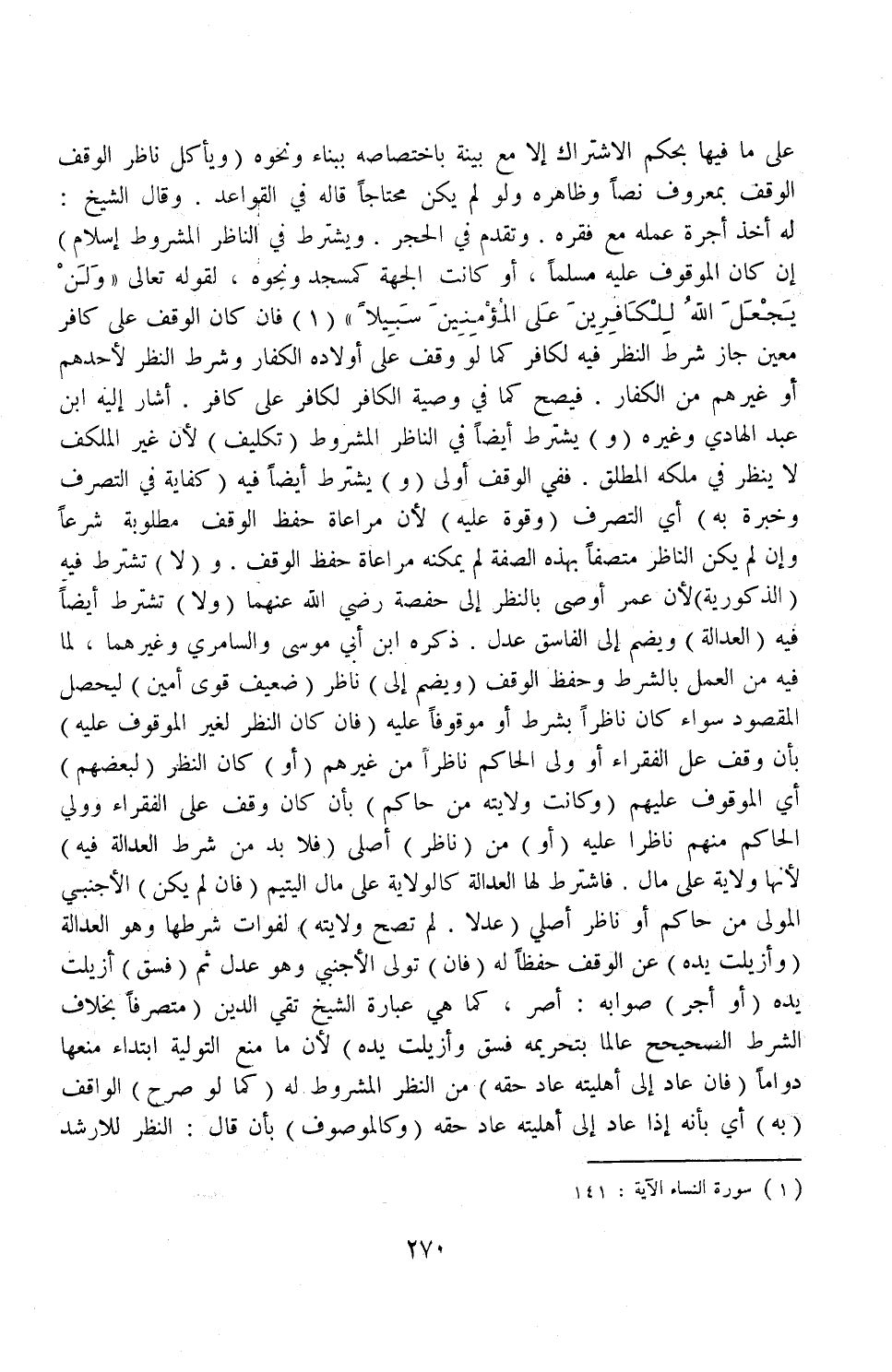 (الْحَجْرُ وَيُشْتَرَطُ فِي النَّاظِرِ الْمَشْرُوطِ إسْلَامٌ) إنْ كَانَ الْمَوْقُوفُ عَلَيْهِ مُسْلِمًا، أَوْ كَانَتْ الْجِهَةُ كَمَسْجِدٍ، وَنَحْوِهِ، لِقَوْلِهِ تَعَالَى {وَلَنْ يَجْعَلَ اللَّهُ لِلْكَافِرِينَ عَلَى الْمُؤْمِنِينَ سَبِيلا} [النساء: ١٤١] فَإِنْ كَانَ الْوَقْفُ عَلَى كَافِرٍ مُعَيَّنٍ جَازَ شَرْطُ النَّظَرِ فِيهِ لَكَافِرٍ كَمَا لَوْ وَقَفَ عَلَى أَوْلَادِهِ الْكُفَّارِ، وَشَرَطَ النَّظَرَ لِأَحَدِهِمْ أَوْ غَيْرِهِمْ مِنْ الْكُفَّارِ، فَيَصِحُّ كَمَا فِي وَصِيَّةِ الْكَافِرِ لَكَافِرٍ عَلَى كَافِرٍ أَشَارَ إلَيْهِ ابْنُ عَبْدِ الْهَادِي، وَغَيْرُهُ.