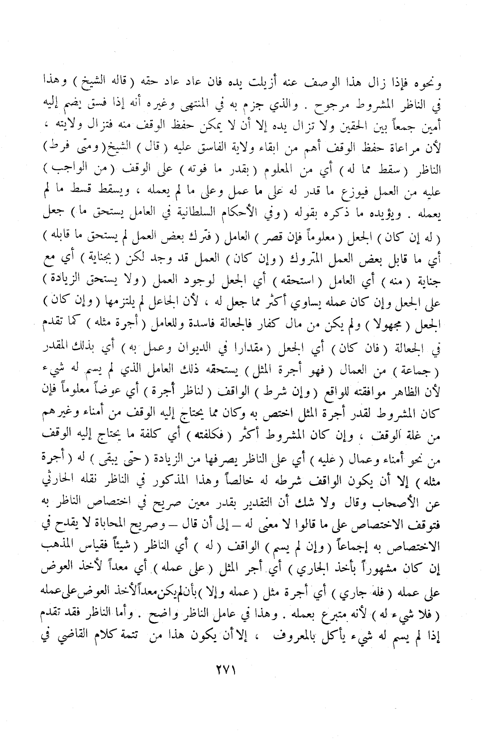 قَالَ الشَّيْخُ (الشَّيْخُ وَمَتَى فَرَّطَ) النَّاظِرُ (سَقَطَ مِمَّا لَهُ) أَيْ: مِنْ الْمَعْلُومِ (بِقَدْرِ مَا فَوَّتَهُ عَلَى الْوَقْفِ مِنْ الْوَاجِبِ) عَلَيْهِ مِنْ الْعَمَلِ فَيُوَزَّعُ مَا قُدِّرَ لَهُ عَلَى مَا عَمِلَ، وَعَلَى مَا لَمْ يَعْمَلْهُ، وَيَسْقُطُ قِسْطُ مَا لَمْ يَعْمَلْهُ، وَيُؤَيِّدُهُ مَا ذَكَرَهُ بِقَوْلِهِ (وَفِي الْأَحْكَامِ السُّلْطَانِيَّةِ فِي الْعَامِلِ يَسْتَحِقُّ مَا) جُعِلَ (لَهُ إنْ كَانَ) الْجُعْلُ (مَعْلُومًا فَإِنْ قَصَّرَ) الْعَامِلُ (فَتَرَكَ بَعْضَ الْعَمَلِ لَمْ يَسْتَحِقَّ مَا قَابَلَهُ) أَيْ: مَا قَابَلَ بَعْضَ الْعَمَلِ الْمَتْرُوكِ (الْمَتْرُوكِ وَإِنْ كَانَ) الْعَمَلُ قَدْ وُجِدَ لَكِنْ (بِجِنَايَةٍ) أَيْ: مَعَ جِنَايَةٍ (مِنْهُ) أَيْ: الْعَامِلِ (اسْتَحَقَّهُ) أَيْ: الْجُعْلَ لِوُجُودِ الْعَمَلِ وَلَا يَسْتَحِقُّ الزِّيَادَةَ عَلَى الْجَعْلِ، وَإِنْ كَانَ عَمَلُهُ يُسَاوِي أَكْثَرَ مِمَّا جُعِلَ لَهُ؛ لِأَنَّ الْجَاعِلَ لَمْ يَلْتَزِمْهَا (يَلْتَزِمْهَا وَإِنْ كَانَ) الْجُعْلُ (مَجْهُولًا) وَلَمْ يَكُنْ مِنْ مَالِ كُفَّارٍ فَالْجِعَالَةُ فَاسِدَةٌ وَلِلْعَامِلِ (أُجْرَةُ مِثْلِهِ) كَمَا تَقَدَّمَ فِي الْجَعَالَةِ (فَإِنْ كَانَ) أَيْ: الْجُعْلُ (مُقَدَّرًا فِي الدِّيوَانِ، وَعَمِلَ بِهِ) أَيْ: بِذَلِكَ الْمُقَدَّرِ جَمَاعَةٌ مِنْ الْعُمَّالِ (فَهُوَ أُجْرَةُ الْمِثْلِ) يَسْتَحِقُّهُ ذَلِكَ الْعَامِلُ الَّذِي لَمْ يُسَمَّ لَهُ شَيْءٌ؛ لِأَنَّ الظَّاهِرَ مُوَافَقَتُهُ لِلْوَاقِعِ.