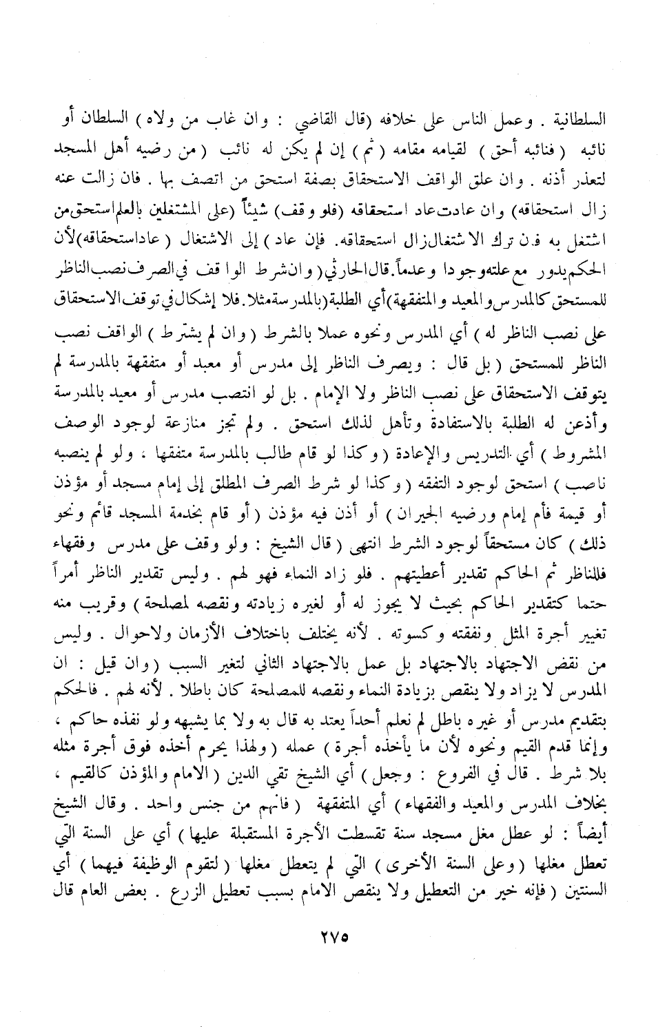 (قَالَ الشَّيْخُ: وَلَوْ وَقَفَ لِمُدَرِّسٍ لِمُدَرِّسٍ وَفُقَهَاء فَلِلنَّاظِرِ ثُمَّ الْحَاكِمِ تَقْدِيرُ أَعْطِيَتِهِمْ فَلَوْ زَادَ النَّمَاءُ فَهُوَ لَهُمْ وَلَيْسَ تَقْدِيرُ النَّاظِرِ أَمْرًا حَتْمًا كَتَقْدِيرِ الْحَاكِمِ بِحَيْثُ لَا يَجُوزُ لَهُ أَوْ لِغَيْرِهِ زِيَادَتُهُ، وَنَقْصُهُ لِمَصْلَحَةٍ) وَقَرِيبٌ مِنْهُ تَغْيِيرُ أُجْرَةِ الْمِثْلِ، وَنَفَقَتِهِ، وَكِسْوَتِهِ؛ لِأَنَّهُ يَخْتَلِفُ بِاخْتِلَافِ الْأَزْمَانِ، وَالْأَحْوَالِ وَلَيْسَ مِنْ نَقْضِ الِاجْتِهَادِ بِالِاجْتِهَادِ بَلْ عَمَلٌ بِالِاجْتِهَادِ الثَّانِي لَتَغَيُّرِ السَّبَبِ (وَإِنْ قِيلَ: أَنَّ الْمُدَرِّسَ لَا يُزَادُ وَلَا يُنْقَصُ بِزِيَادَةِ النَّمَاءِ، وَنَقْصِهِ لِلْمَصْلَحَةِ كَانَ بَاطِلًا؛ لِأَنَّهُ لَهُمْ فَالْحُكْمُ بِتَقْدِيمِ مُدَرِّسٍ أَوْ غَيْرِهِ بَاطِلٌ لَمْ نَعْلَمْ أَحَدًا يُعْتَدُّ بِهِ قَالَ بِهِ وَلَا بِمَا يُشْبِهُهُ وَلَوْ نَفَّذَهُ حَاكِمٌ، وَإِنَّمَا قُدِّمَ الْقَيِّمُ، وَنَحْوُهُ؛ لِأَنَّ مَا يَأْخُذُهُ أُجْرَةُ) .