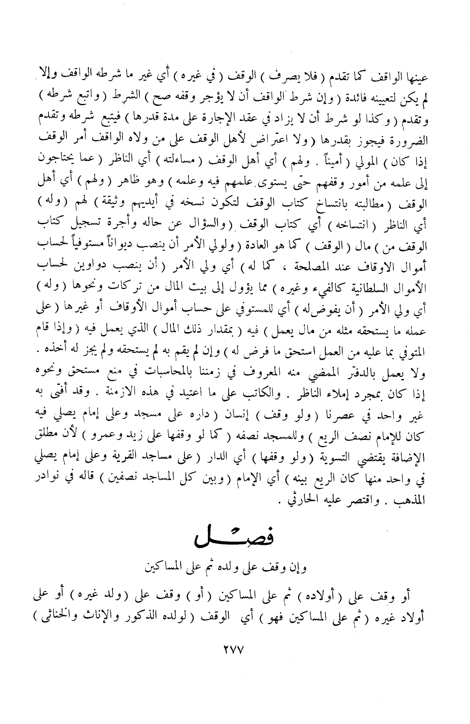 ، (فَصْلٌ وَإِنْ وَقَفَ عَلَى وَلَدِهِ) ثُمَّ عَلَى الْمَسَاكِينِ (أَوْ) وَقَفَ عَلَى (أَوْلَادِهِ) ثُمَّ عَلَى الْمَسَاكِينِ (أَوْ) وَقَفَ عَلَى (وَلَدِ غَيْرِهِ) أَوْ عَلَى أَوْلَادِ غَيْرِهِ (ثُمَّ عَلَى الْمَسَاكِينِ فَهُوَ) أَيْ: الْوَقْفُ (لِوَلَدِهِ الذُّكُورِ الذُّكُورِ وَالْإِنَاثِ وَالْإِنَاثِ وَالْخَنَاثَى)