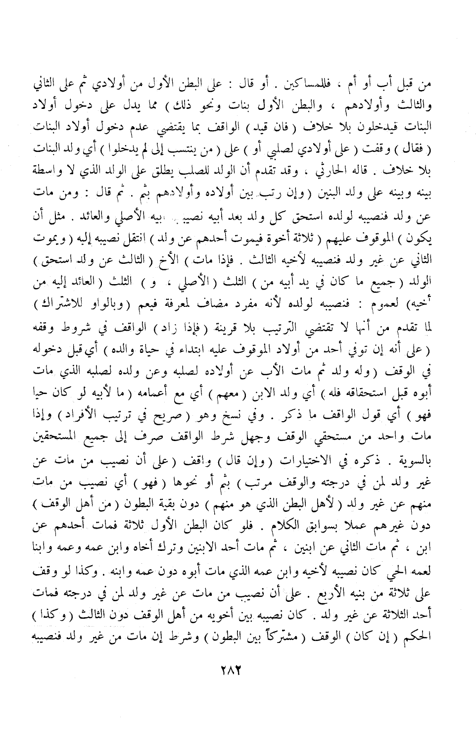 (وَإِنْ قَالَ) وَاقِفٌ (عَلَى أَنَّ نَصِيبَ مَنْ مَاتَ عَنْ غَيْرِ وَلَدٍ لِمَنْ فِي دَرَجَتِهِ وَالْوَقْفُ مُرَتَّبٌ) بِثُمَّ أَوْ نَحْوِهَا (فَهُوَ) أَيْ: نَصِيبُ مَنْ مَاتَ مِنْهُمْ عَنْ غَيْرِ وَلَدٍ (لِأَهْلِ الْبَطْنِ الَّذِي هُوَ مِنْهُمْ) دُونَ بَقِيَّةِ الْبُطُونِ (مِنْ أَهْلِ الْوَقْفِ) دُونَ غَيْرِهِمْ عَمَلًا بِسَوَابِقِ الْكَلَامِ فَلَوْ كَانَ الْبَطْنُ الْأَوَّلُ ثَلَاثَةً فَمَاتَ أَحَدُهُمْ عَنْ ابْنٍ، ثُمَّ مَاتَ الثَّانِي عَنْ ابْنَيْنِ، ثُمَّ مَاتَ أَحَدُ الِابْنَيْنِ، وَتَرَكَ أَخَاهُ، وَابْنَ عَمِّهِ، وَعَمَّهُ، وَابْنًا لِعَمِّهِ الْحَيِّ كَانَ نَصِيبُهُ لِأَخِيهِ، وَابْنِ عَمِّهِ الَّذِي مَاتَ أَبُوهُ دُونَ عَمِّهِ، وَابْنِهِ وَكَذَا لَوْ وَقَفَ عَلَى ثَلَاثَةٍ مِنْ بَنِيهِ الْأَرْبَعِ عَلَى أَنَّ نَصِيبَ مَنْ مَاتَ عَنْ غَيْرِ وَلَدٍ لِمَنْ فِي دَرَجَتِهِ فَمَاتَ أَحَدُ الثَّلَاثَةِ عَنْ غَيْرِ وَلَدٍ كَانَ نَصِيبُهُ بَيْنَ أَخَوَيْهِ مِنْ أَهْلِ الْوَقْفِ دُونَ الثَّالِثِ.