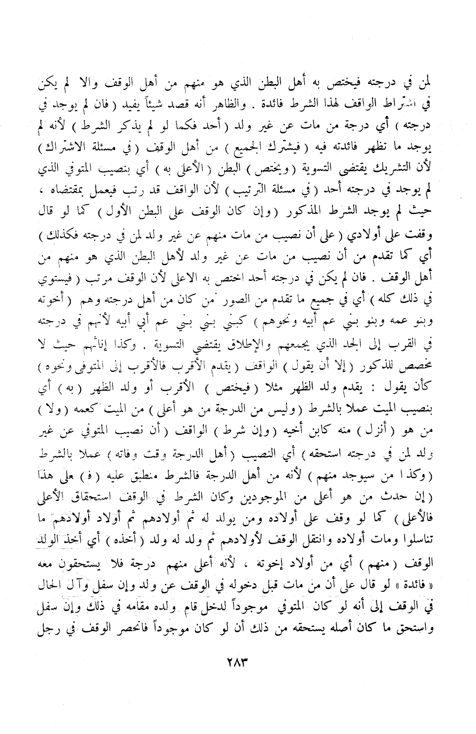وَكَذَا إنَاثُهُمْ حَيْثُ لَا مُخَصِّصَ لِلذُّكُورِ (إلَّا أَنْ يَقُولَ) الْوَاقِفُ (يُقَدَّمُ الْأَقْرَبُ فَالْأَقْرَبُ إلَى الْمُتَوَفَّى، وَنَحْوِهِ) كَأَنْ يَقُولَ: يُقَدَّمُ وَلَدُ الظَّهْرِ مَثَلًا (فَيَخْتَصُّ) الْأَقْرَبُ أَوْ وَلَدُ الظَّهْرِ (بِهِ) أَيْ: بِنَصِيبِ الْمَيِّتِ عَمَلًا بِالشَّرْطِ (وَلَيْسَ مِنْ الدَّرَجَةِ مَنْ هُوَ أَعْلَى) مِنْ الْمَيِّتِ كَعَمِّهِ (وَلَا) مَنْ هُوَ (أَنْزَلُ) مِنْهُ كَابْنِ أَخِيهِ.