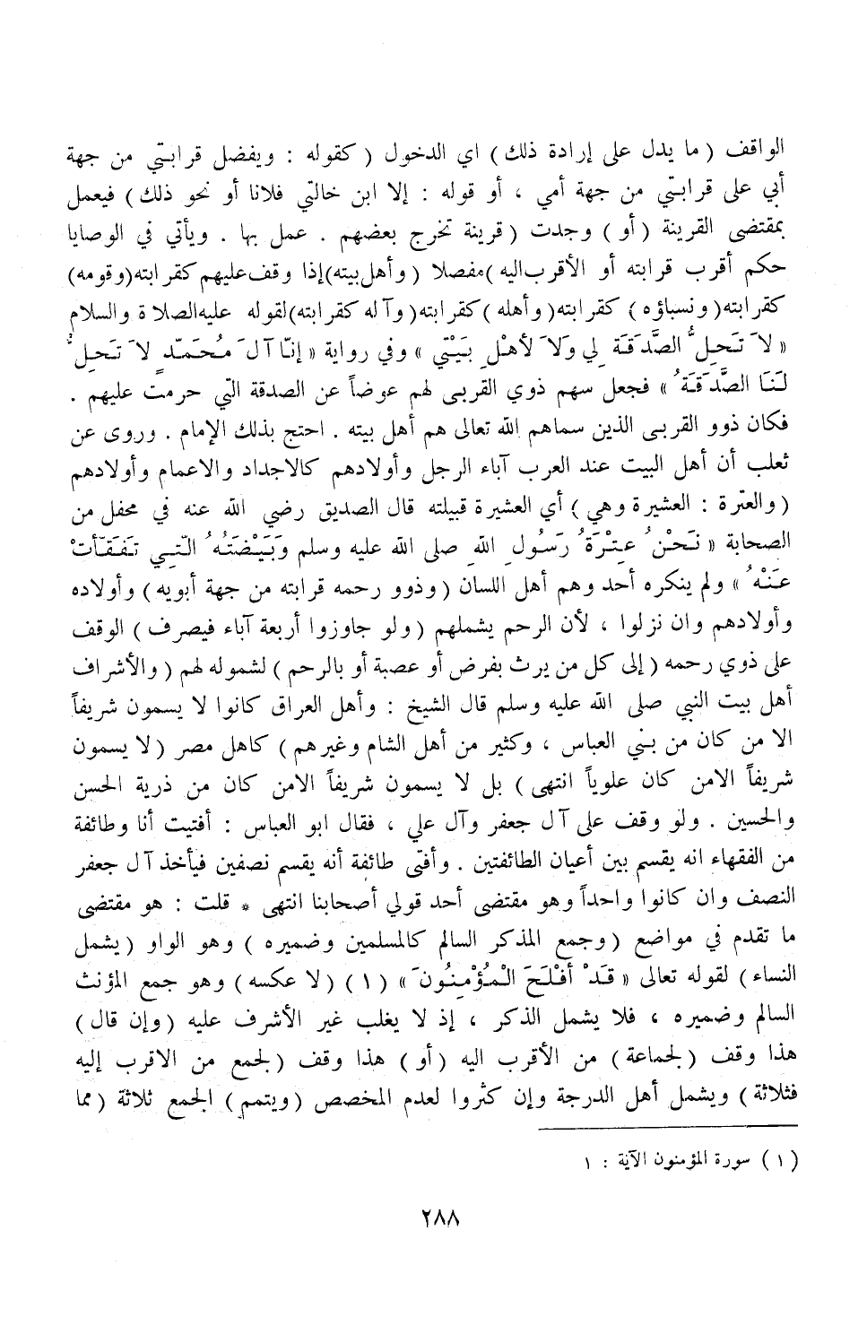 (وَلَوْ جَاوَزُوا أَرْبَعَةَ آبَاءٍ فَيُصْرَفُ) الْوَقْفُ عَلَى ذَوِي رَحِمِهِ (إلَى كُلِّ مَنْ يَرِثُ بِفَرْضٍ أَوْ عَصَبَةٍ أَوْ بِالرَّحِمِ) لِشُمُولِهِ لَهُمْ (وَالْأَشْرَافُ أَهْلُ بَيْتِ النَّبِيِّ - صَلَّى اللَّهُ عَلَيْهِ وَسَلَّمَ - قَالَ الشَّيْخُ: وَأَهْلُ الْعِرَاقِ كَانُوا لَا يُسَمُّونَ شَرِيفًا إلَّا مَنْ كَانَ مِنْ بَنِي الْعَبَّاسِ وَكَثِيرٌ مِنْ أَهْلِ الشَّامِ، وَغَيْرِهِمْ) كَأَهْلِ مِصْرَ (لَا يُسَمُّونَ شَرِيفًا إلَّا مَنْ كَانَ عَلَوِيًّا انْتَهَى) بَلْ لَا يُسَمُّونَ شَرِيفًا إلَّا مَنْ كَانَ مِنْ ذُرِّيَّةِ الْحَسَنِ وَالْحُسَيْنِ.