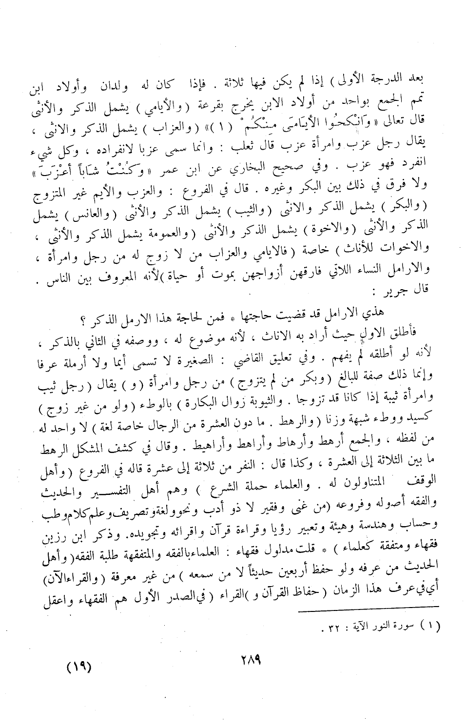 بَعْدَ الدَّرَجَةِ الْأُولَى) إذَا لَمْ يَكُنْ فِيهَا ثَلَاثَةٌ، فَإِذَا كَانَ لَهُ وَلَدَانِ، وَأَوْلَادُ ابْنٍ تَمَّمَ الْجَمْعَ بِوَاحِدٍ مِنْ أَوْلَادِ الِابْنِ يَخْرُجُ بِقُرْعَةٍ (وَالْأَيَامَى) يَشْمَلُ الذَّكَرَ وَالْأُنْثَى قَالَ تَعَالَى " وَأَنْكِحُوا الْأَيَامَى مِنْكُمْ " (وَالْعُزَّابُ) يَشْمَلُ الذَّكَرَ وَالْأُنْثَى، يُقَالُ: رَجُلٌ عَزَبٌ، وَامْرَأَةٌ عَزَبٌ قَالَ ثَعْلَبٌ:، وَإِنَّمَا سُمِّيَ عَزَبًا لِانْفِرَادِهِ وَكُلُّ شَيْءٍ انْفَرَدَ فَهُوَ عَزَبٌ.