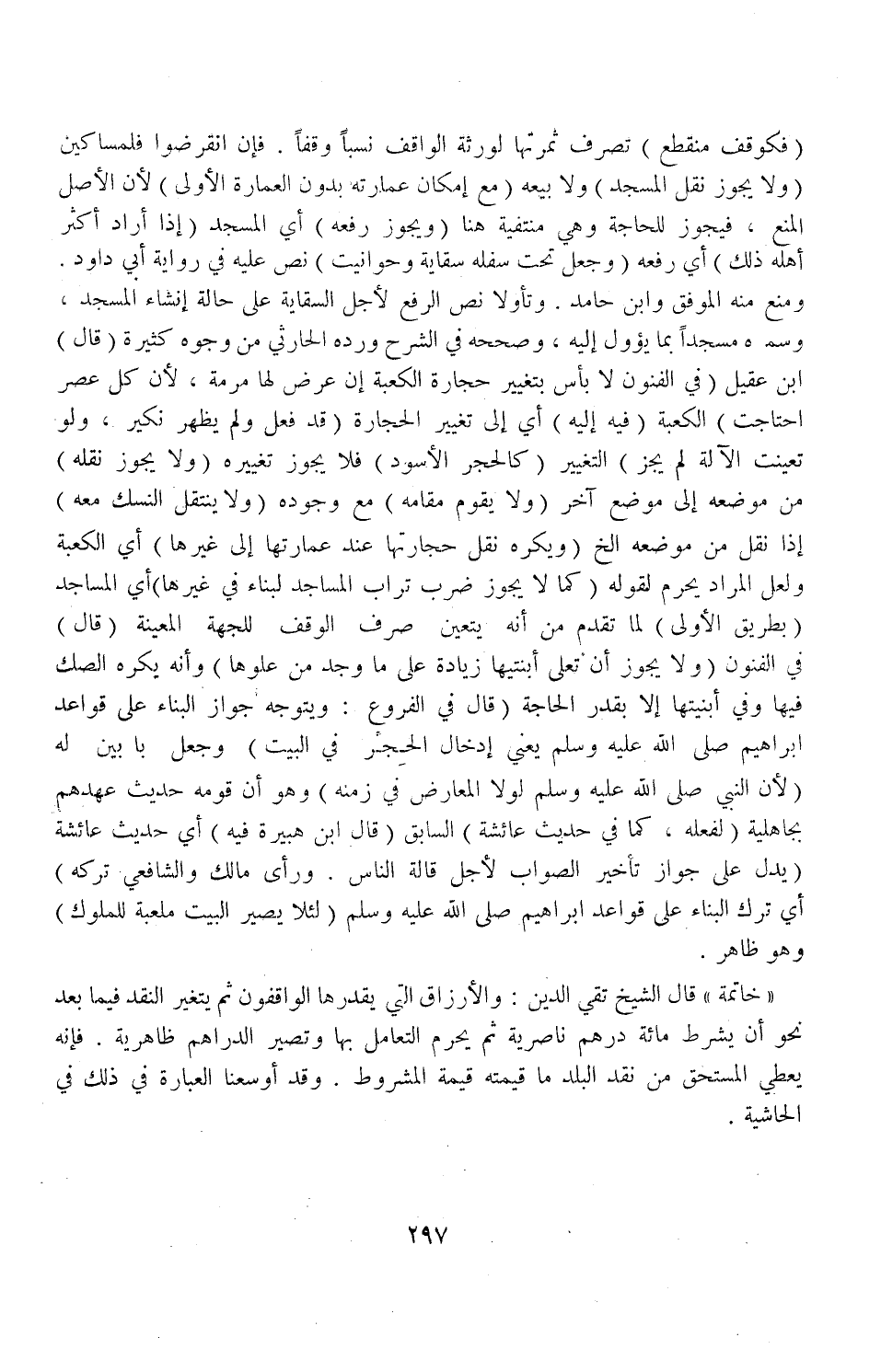 " خَاتِمَةٌ قَالَ الشَّيْخُ تَقِيُّ الدِّينِ: وَالْأَرْزَاقُ الَّتِي يُقَدِّرُهَا الْوَاقِفُونَ ثُمَّ يَتَغَيَّرُ النَّقْدُ فِيمَا بَعْدُ نَحْوُ أَنْ يَشْرِطَ مِائَةَ دِرْهَمٍ نَاصِرِيَّةً ثُمَّ يَحْرُمُ التَّعَامُلُ بِهَا، وَتَصِيرُ الدَّرَاهِمُ ظَاهِرِيَّةً، فَإِنَّهُ يُعْطِي الْمُسْتَحِقَّ مِنْ نَقْدِ الْبَلَدِ مَا قِيمَتُهُ قِيمَةُ الْمَشْرُوطِ وَقَدْ أَوْسَعْنَا الْعِبَارَةَ فِي ذَلِكَ فِي الْحَاشِيَةِ.