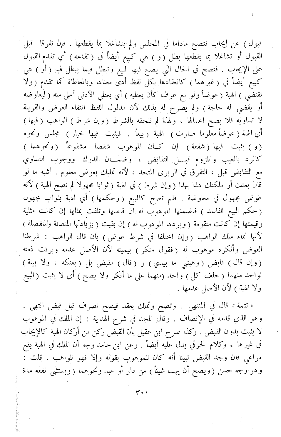" تَتِمَّةٌ قَالَ فِي الْمُنْتَهَى: وَتَصِحُّ، وَتُمْلَكُ بِعَقْدٍ فَيَصِحُّ تَصَرُّفٌ قَبْلَ قَبْضٍ انْتَهَى وَهُوَ الَّذِي قَدَّمَهُ فِي الْإِنْصَافِ وَقَالَ الْمَجْدُ فِي شَرْحِ الْهِدَايَةِ: إنَّ الْمِلْكَ فِي الْمَوْهُوبِ لَا يَثْبُتُ بِدُونِ الْقَبْضِ وَكَذَا صَرَّحَ ابْنُ عَقِيلٍ بِأَنَّ الْقَبْضَ رُكْنٌ مِنْ أَرْكَانِ الْهِبَةِ كَالْإِيجَابِ فِي غَيْرِهَا وَكَلَامُ الْخِرَقِيِّ يَدُلُّ عَلَيْهِ أَيْضًا، وَعَنْ ابْنِ حَامِدٍ وَجْهُ أَنَّ الْمِلْكَ فِي الْهِبَةِ يَقَعُ مُرَاعًى فَإِنْ وُجِدَ الْقَبْضُ تَبَيَّنَّا أَنَّهُ كَانَ لِلْمَوْهُوبِ بِقَوْلِهِ: وَإِلَّا فَهُوَ لِلْوَاهِبِ قُلْت: وَهُوَ وَجْهٌ حَسَنٌ.